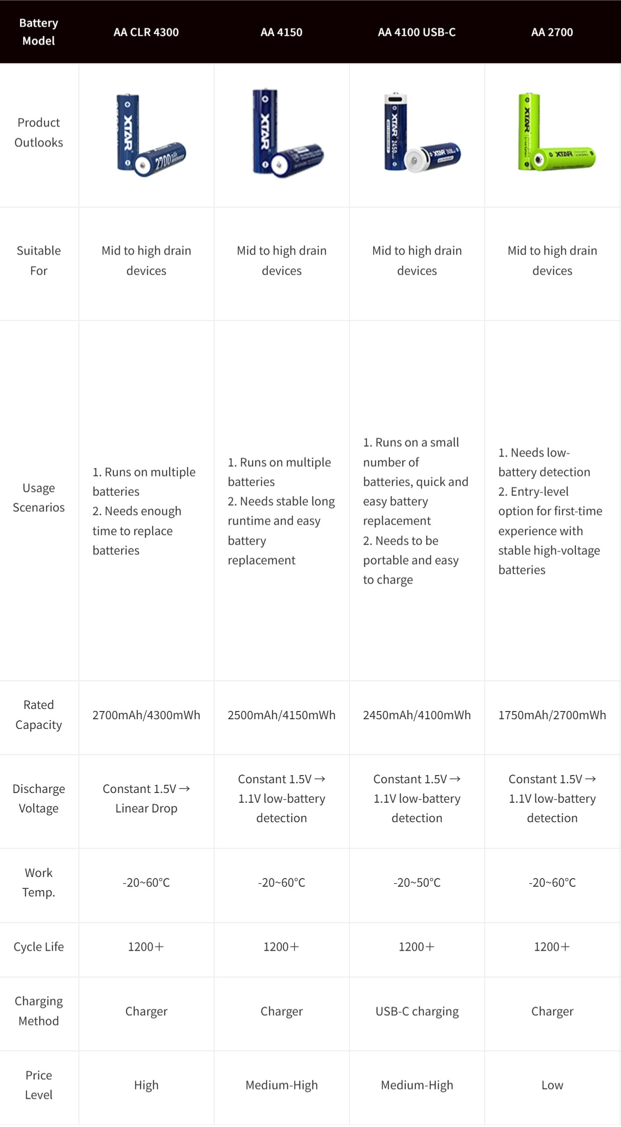 There is a comparison chart of different XTAR AA lithium-ion batteries, along with recommended models tailored for different demands.