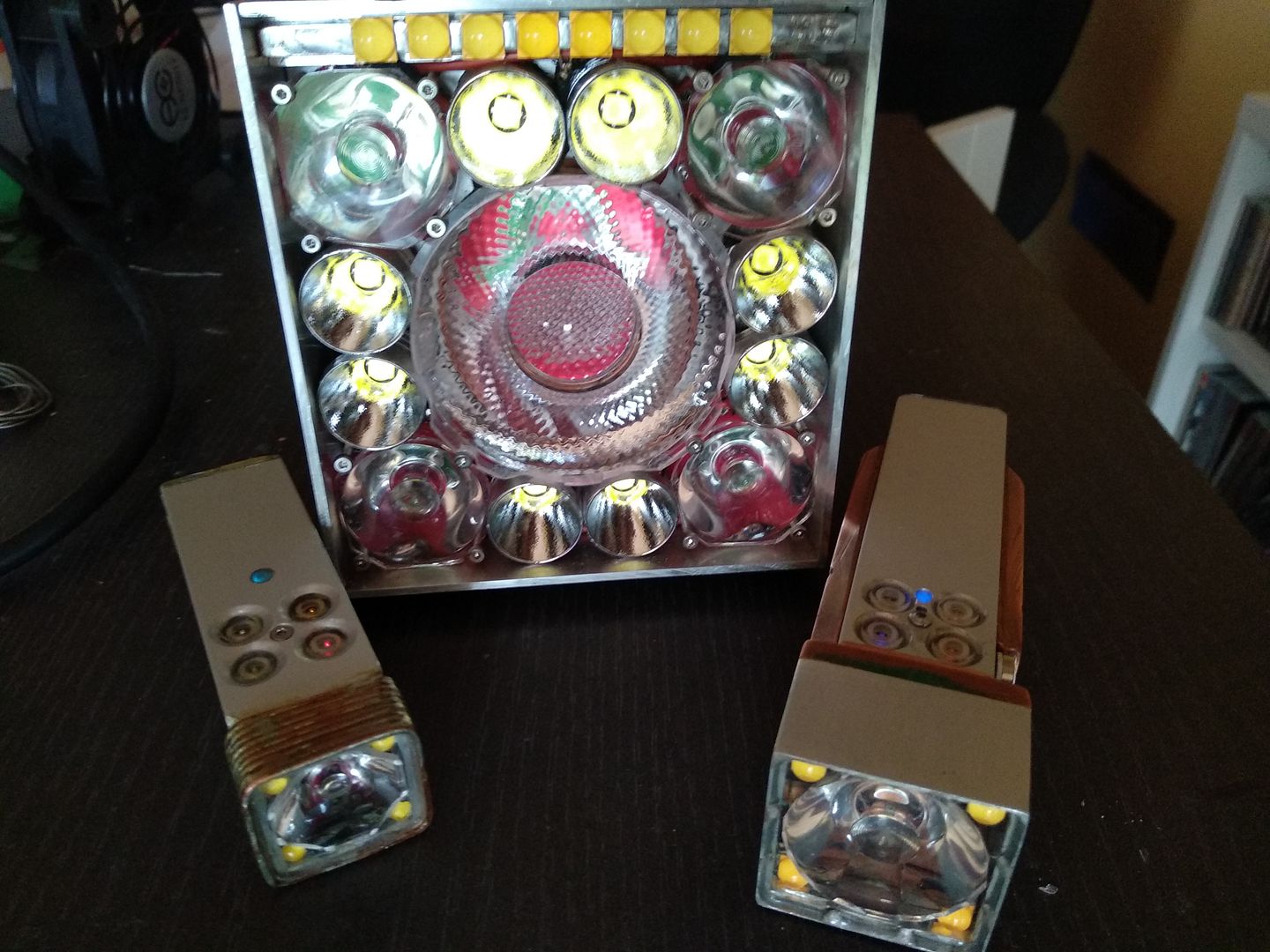 Size comparison to the light I built before (the samller has 18650 cell, 4x XPL2 for flood and XHP35+20mm TIR spot, 6000Lumen peak, 35kCd; the larger 21700 cell, 4x XHP50.2 flood, XHP35+30mm TIR spot, 12000Lumen peak, 76kCd):