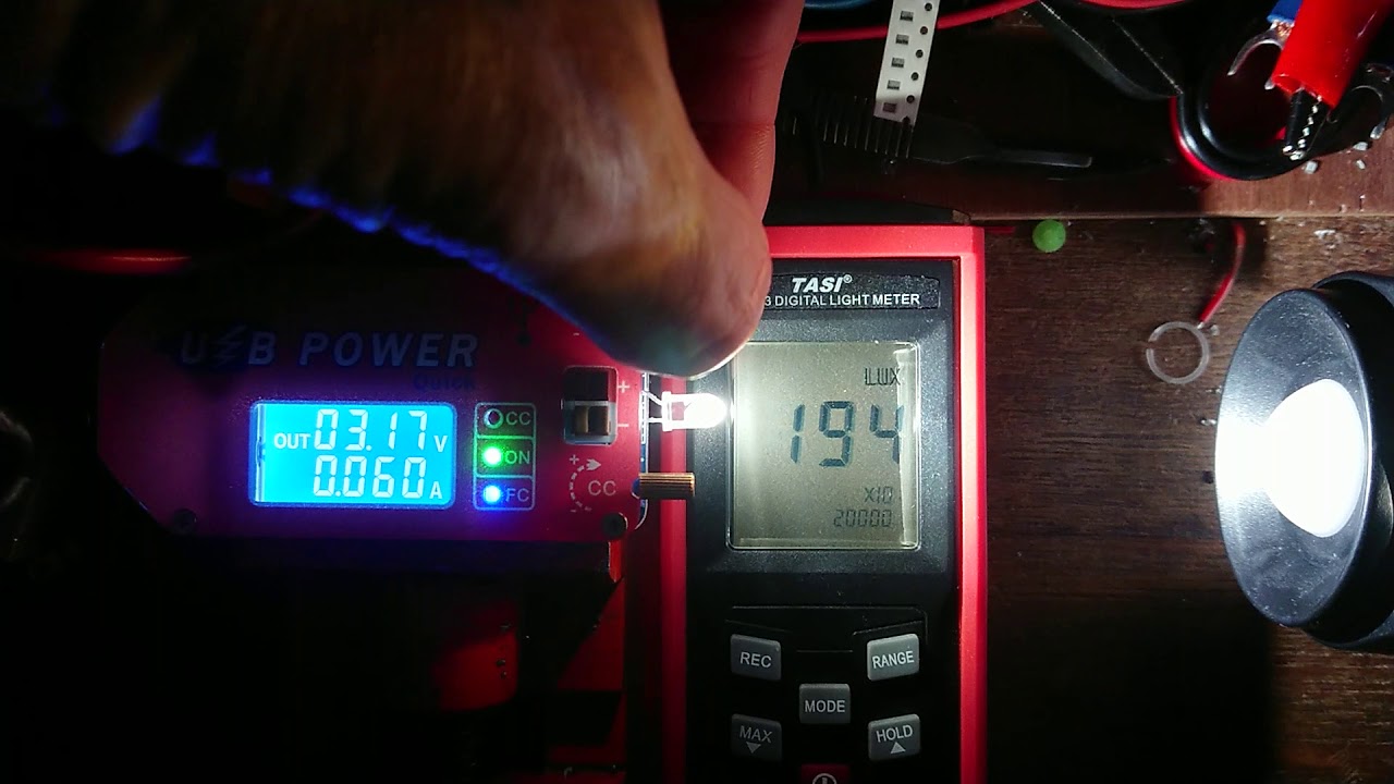 The light output. I made no graph (not enough time) but a video. You see the led shining at a luxmeter that I placed at a precise distance so that the luxmeter reading is quite exact 10 times the output in lumen. So a reading of 93 corresponds to 9.3 lumen total output. The voltage and current can be read from the USB power supply. I checked, they are not greatly off from reality.