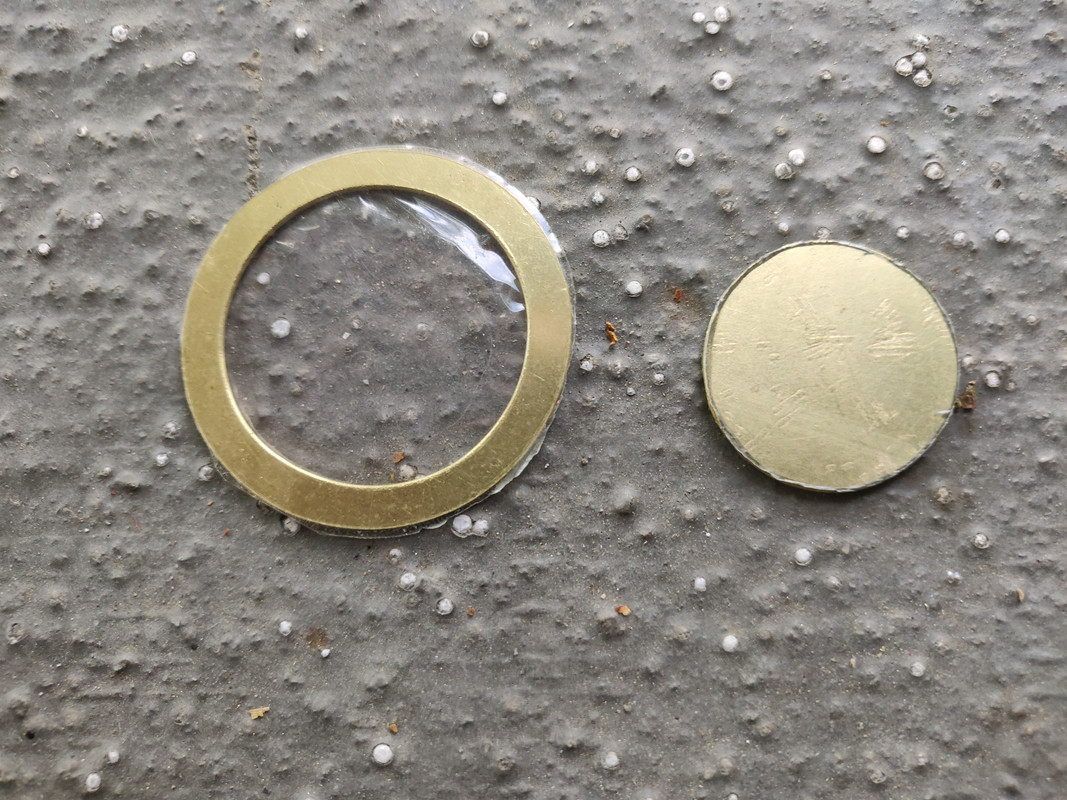 Negative contact/retaining ring and positive contact disc from 18 ga brass sheet ready to solder to driver.
