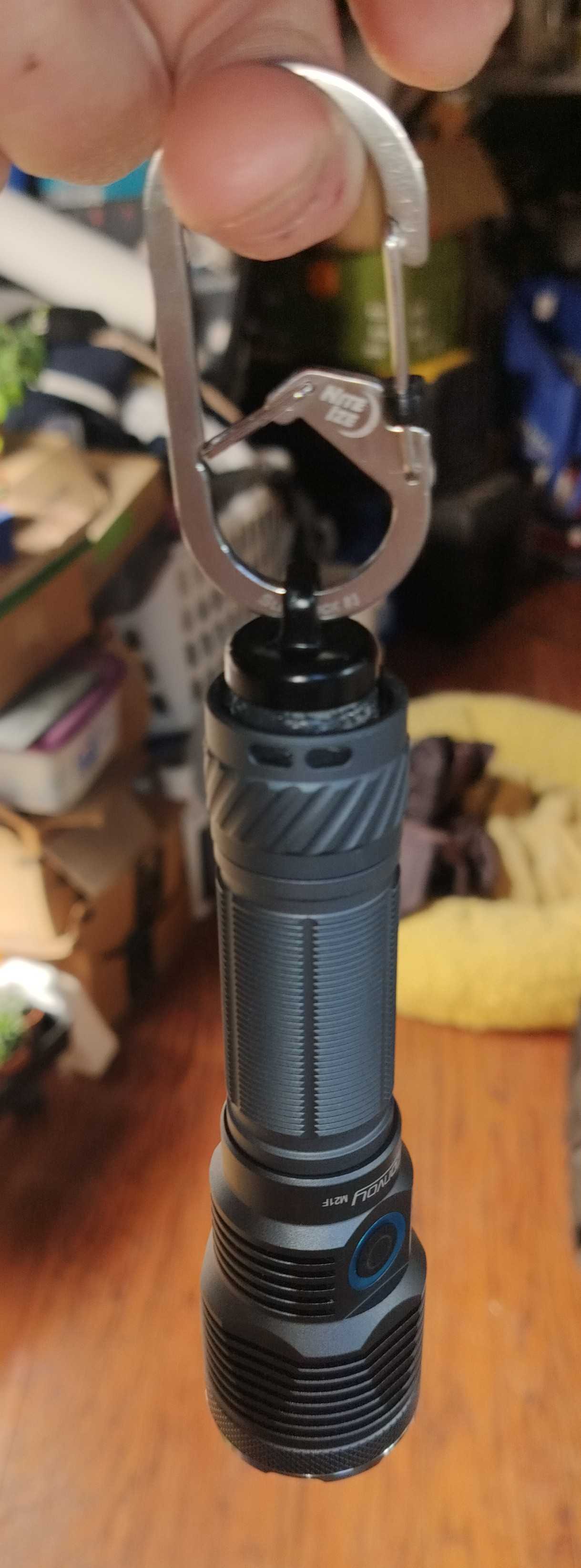 The magnet hooked to the carabiner is a generic olight ring magnet. I have seven flashlights that are hanging from these magnets. It makes it really handy.