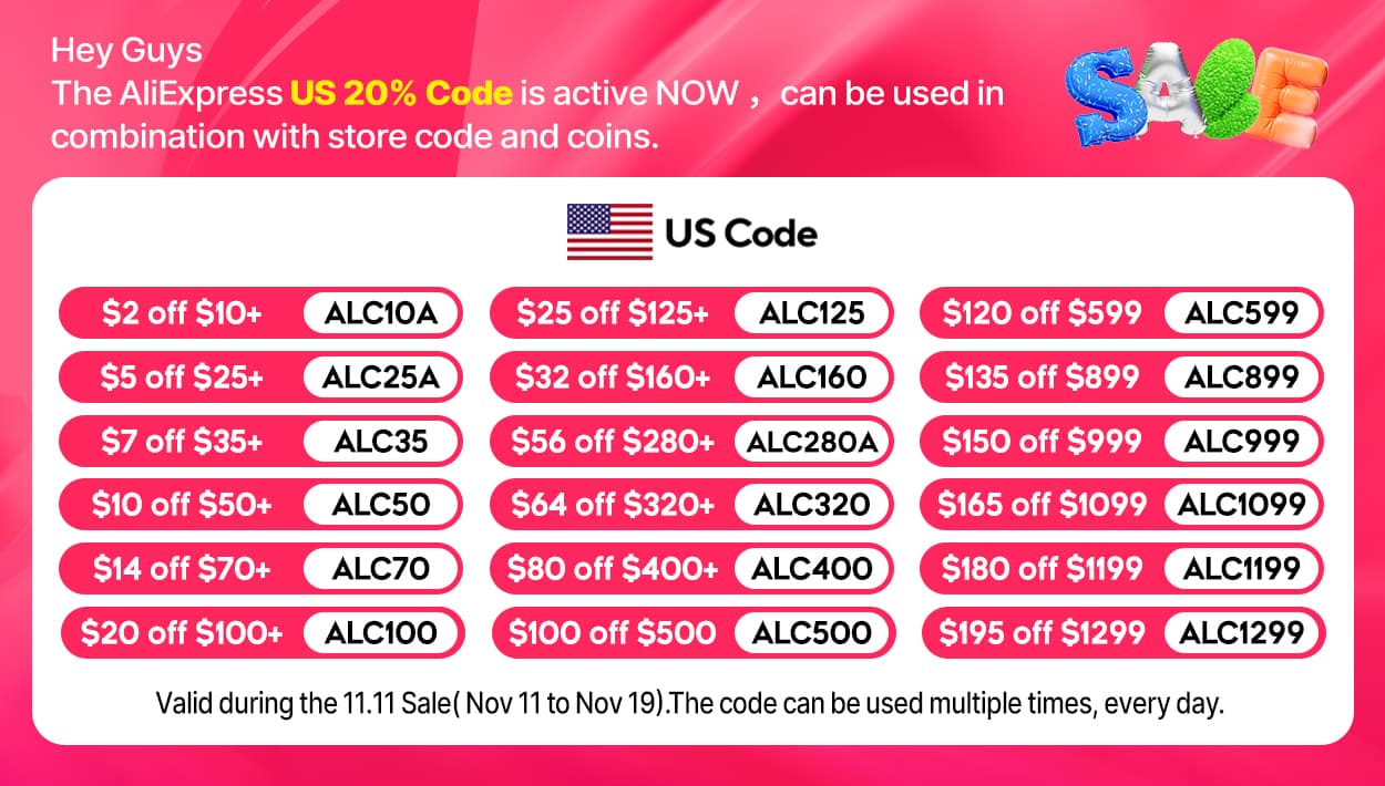 it is the second day of the 11.11 sale, aliexpress gives some codes, if you live in US area, you can use these codes, if there are other codes, we will send them in time