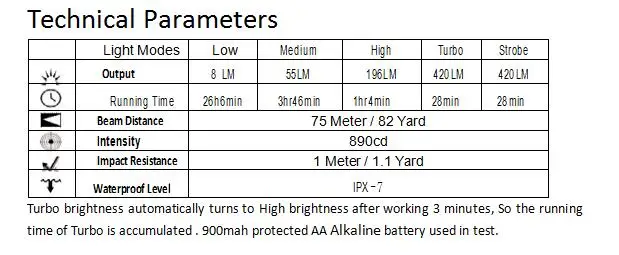 Low (8 lm)- Medium (55 lm)- High (196 lm)- Turbo (420 lm)- Strobe (420 lm)