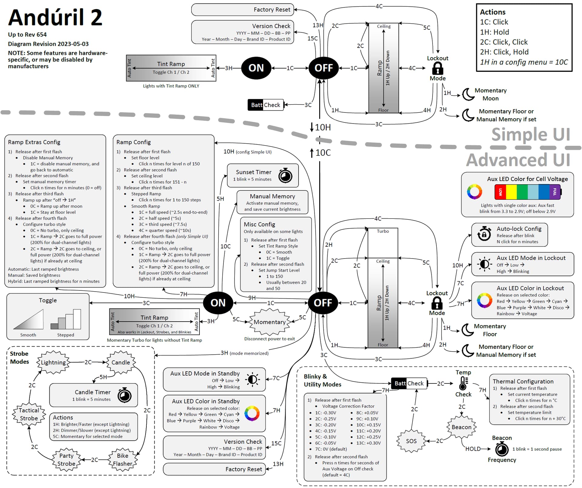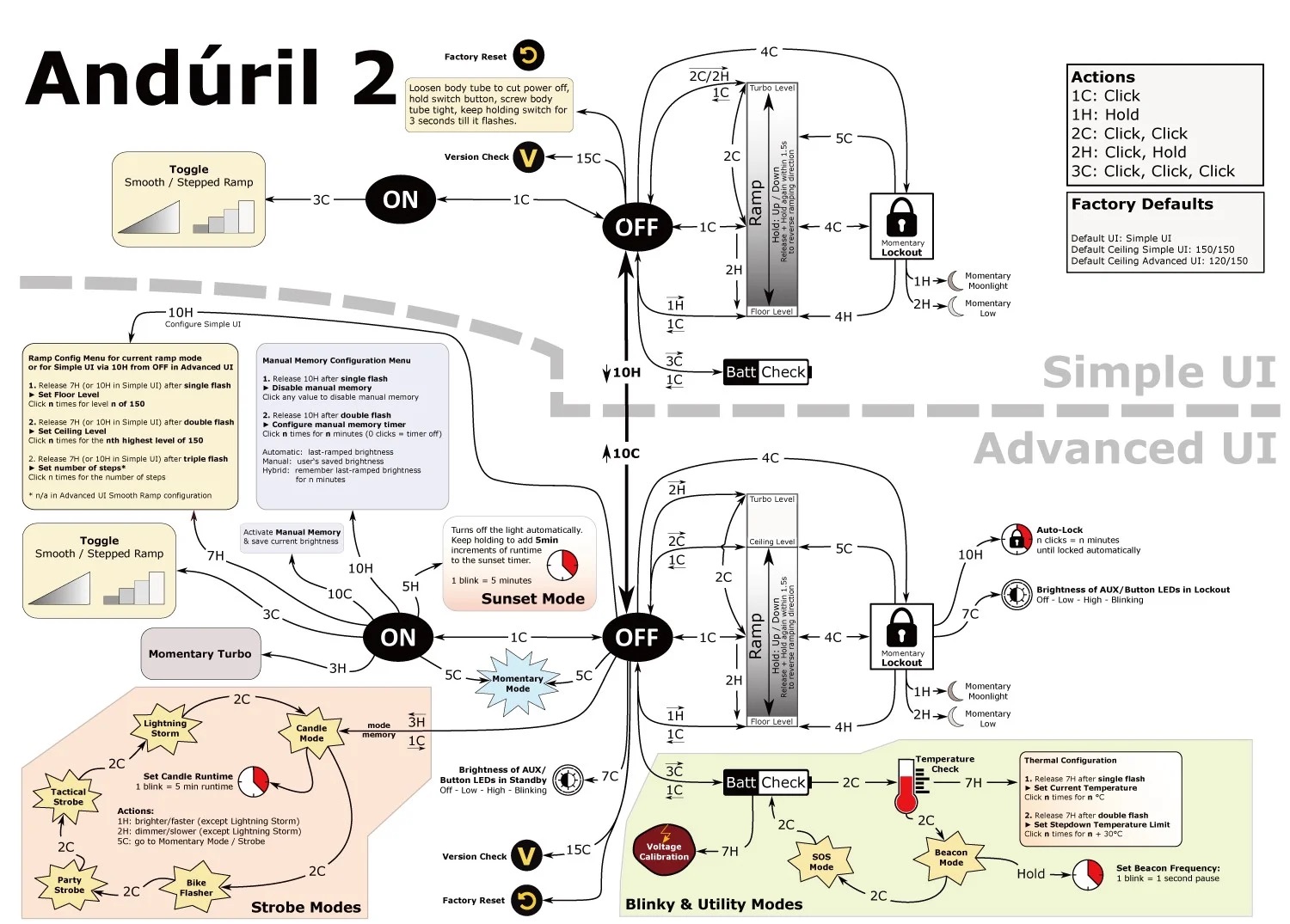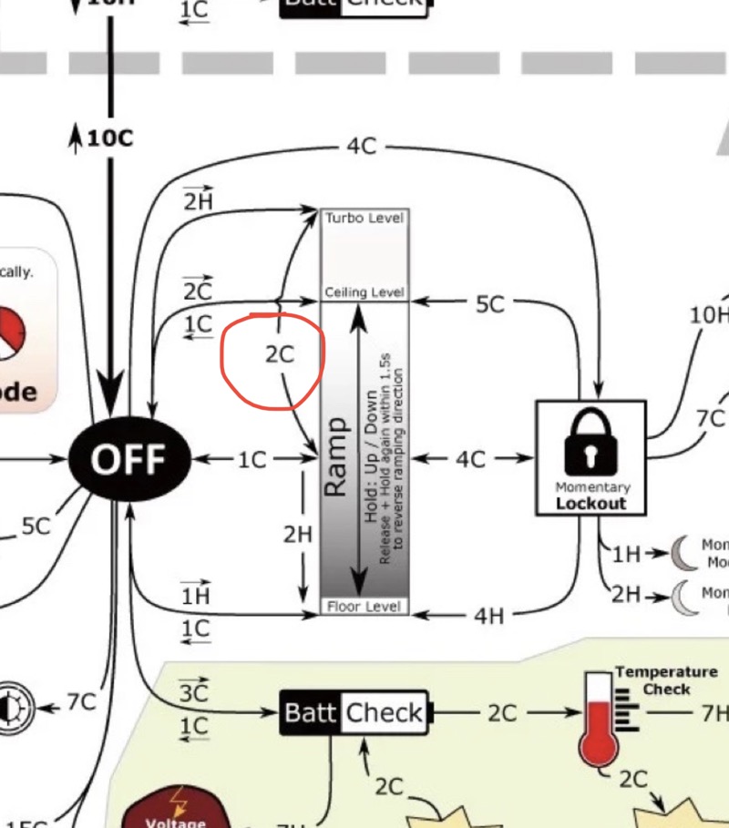 My Sofirn SC31 Pro was set with the Anduril2 style, 2C to top of ramp, and then 2C turbo. And it would 2C turbo from off too. In the advanced UI that is. Simple UI had no Turbo available. And for whatever reason, you cant 3C from locked to off… only 4C to on. But both my other lights can 3C to off. I think its a newer feature than when the SC31s were compiled for.