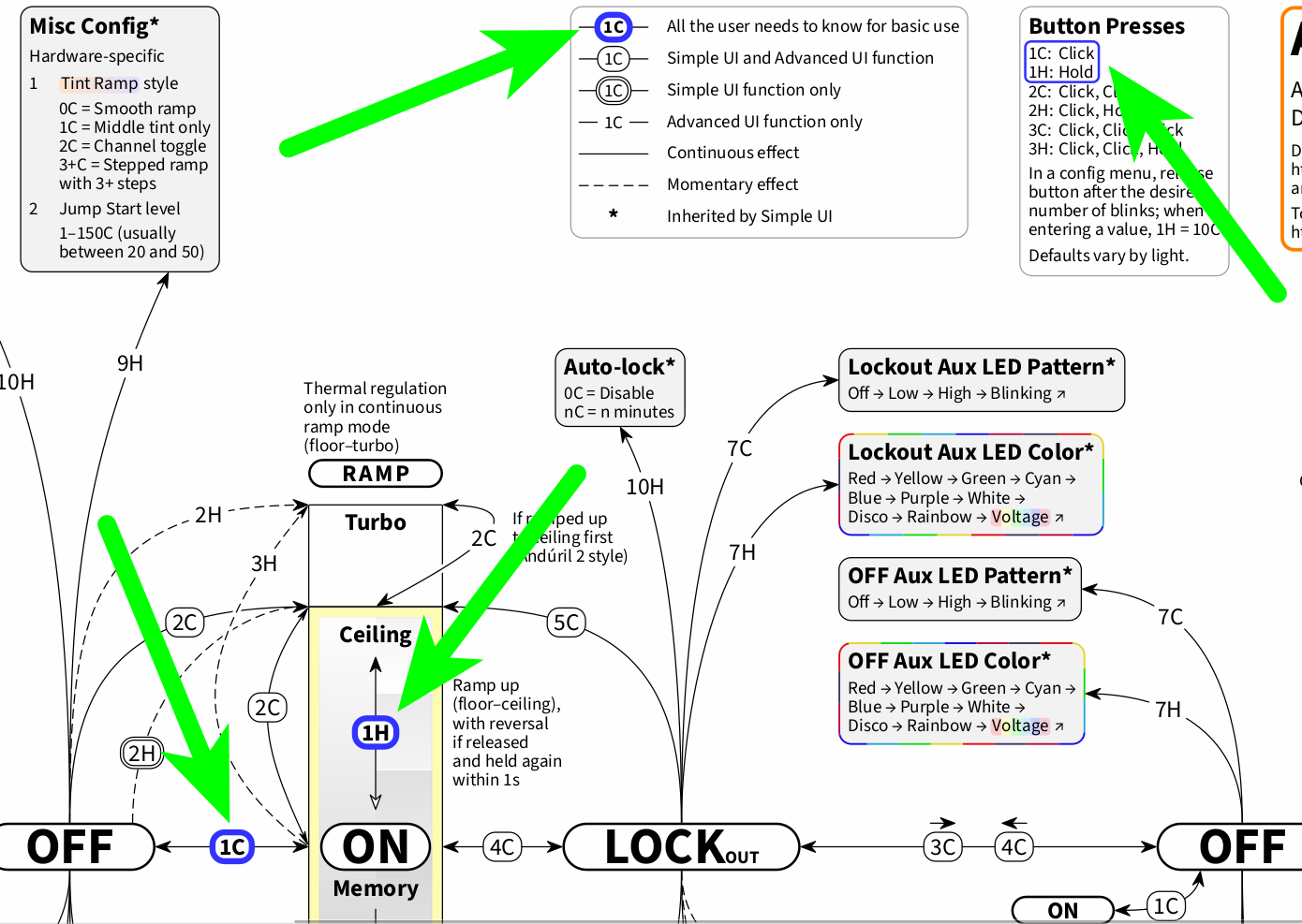 Yeah, this is one issue that the chart aims to address: The brightness ramp image is placed in the very center of the page as a landmark, and basic use (1C and 1H, click and hold) is emphasized and singled out. And also the way back from the outskirts to the very center, in Simple UI, is illustrated with the connection from factory reset to Simple UI. So even if a user gets lost (hard to imagine at least in Simple UI, but I am probably completely biased here), a fresh start is just 13H from Off away.