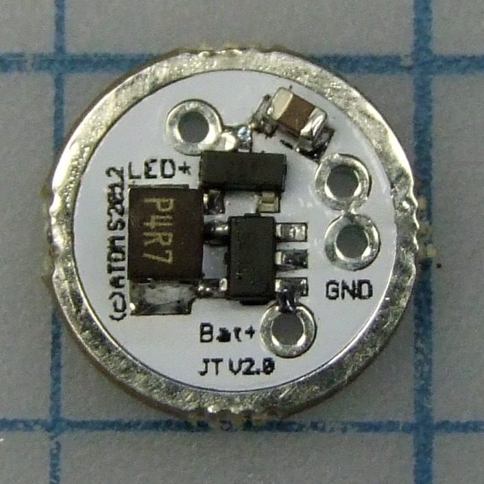 Dave can of course make several drop-ins for you each with different LED's, reflectors, etc. Dave has some low vf LED's as well, which would be a little bit more efficient as my boost driver would have to work a little bit less hard with a lower vf. Just remember that since Dave is using my "driver", and my driver is by definition a single mode/single level driver, designed to drain AA and CR123 cells down to 0.8 volts, so everything I listed about what the driver can and can't do still applies. Dave is doing the hard work to turn/package the Joule Thief board into a completed module (turn-key) so that it is a lot easier to use ;)