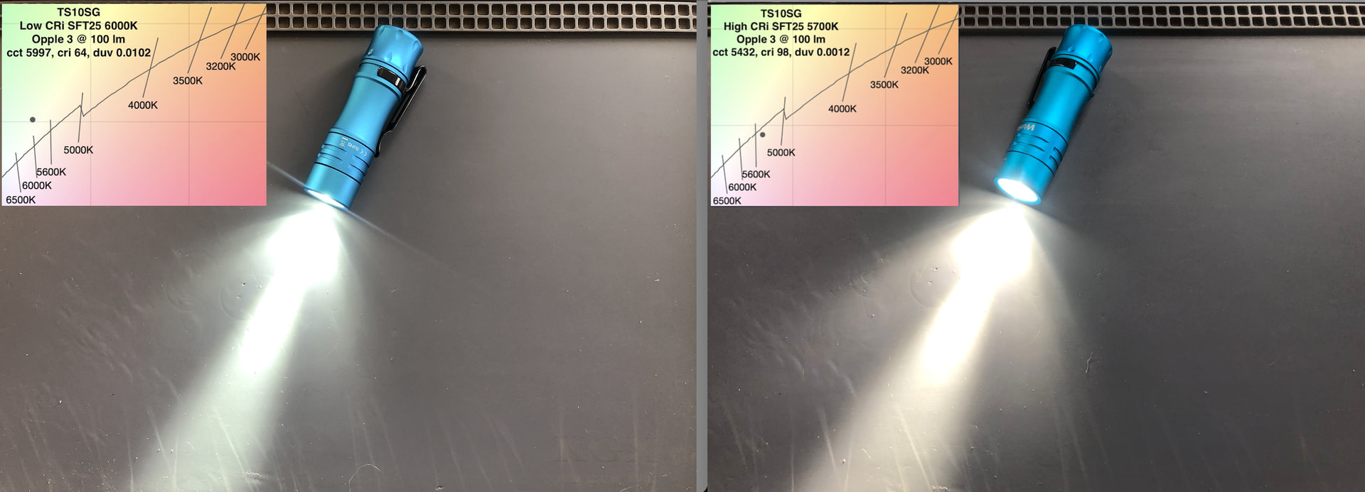 I modded a Wurkkos TS10SG by removing the Low CRI SFT25 and installing a High CRI SFT25.. here are the Opple results before and after: