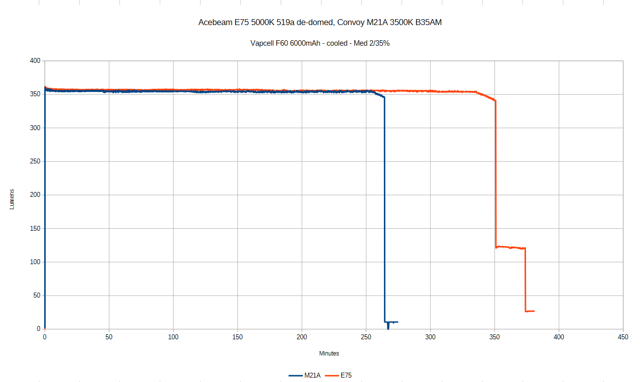 I posted a comparison of the E75 vs the LumeX1 w/ NTG50 in a different thread. I don’t know how the LES compares between the B35AM and the NTG50 though. But it had a runtime (at a higher output level though) that was quite close to the E75. They also take different battery sizes, so that adds some uncertainty as well.
