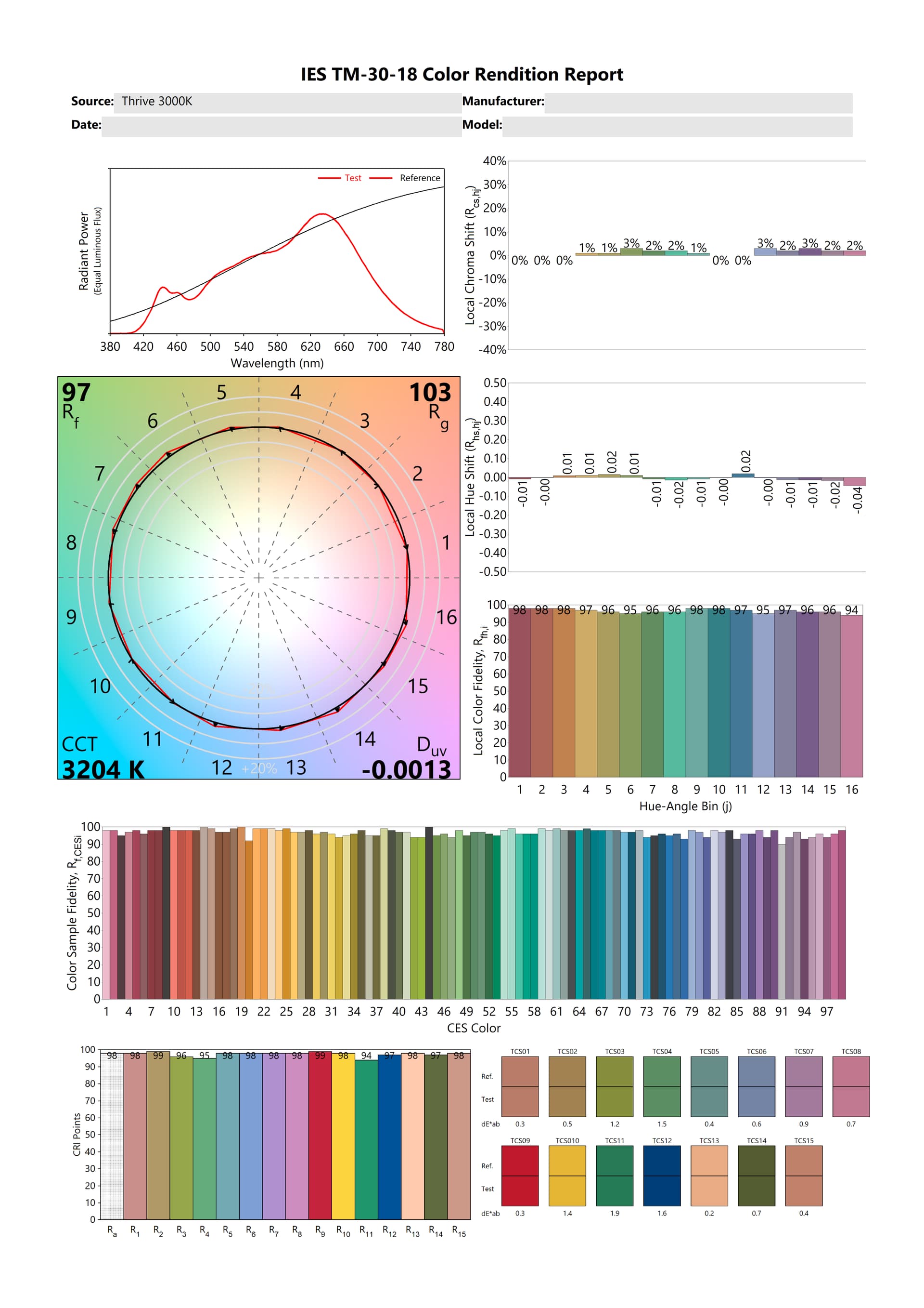 Here’s TM-30 for a 3000K Thrive 1W 2835 emitter I measured a while back. It still has a bit of a blue spike, but seems more in line with the datasheet.