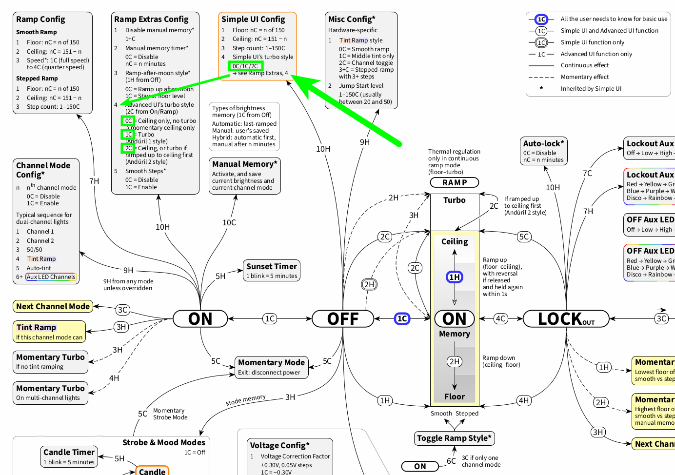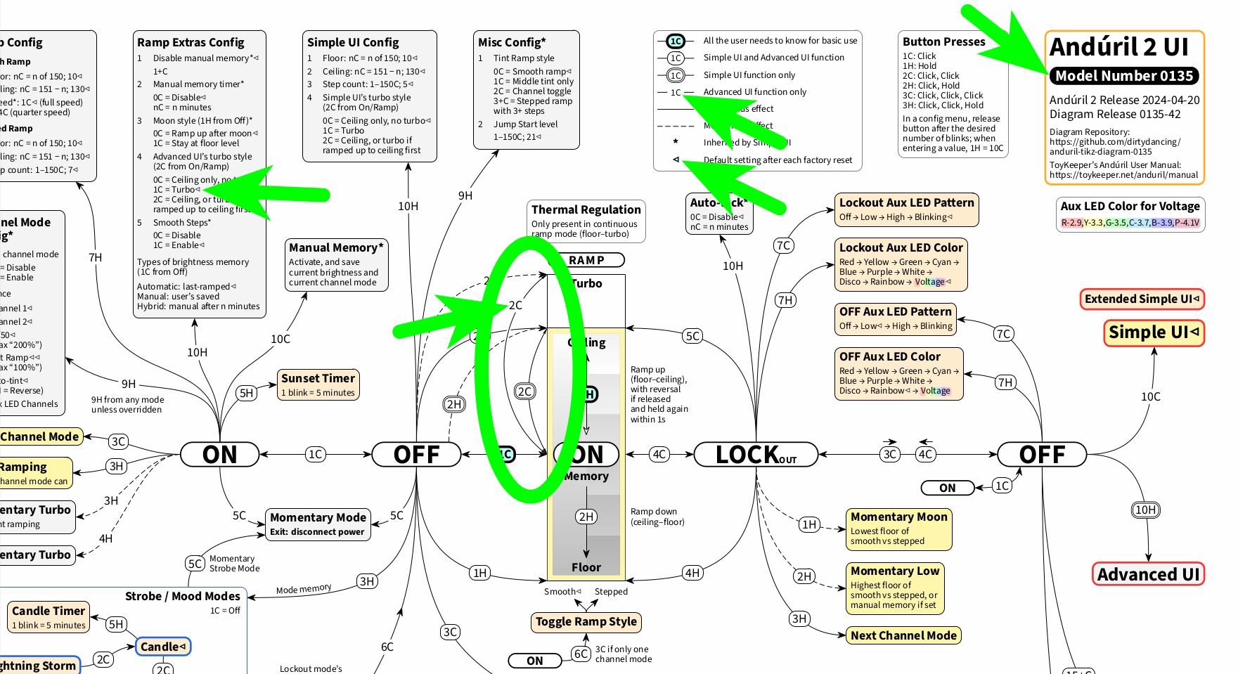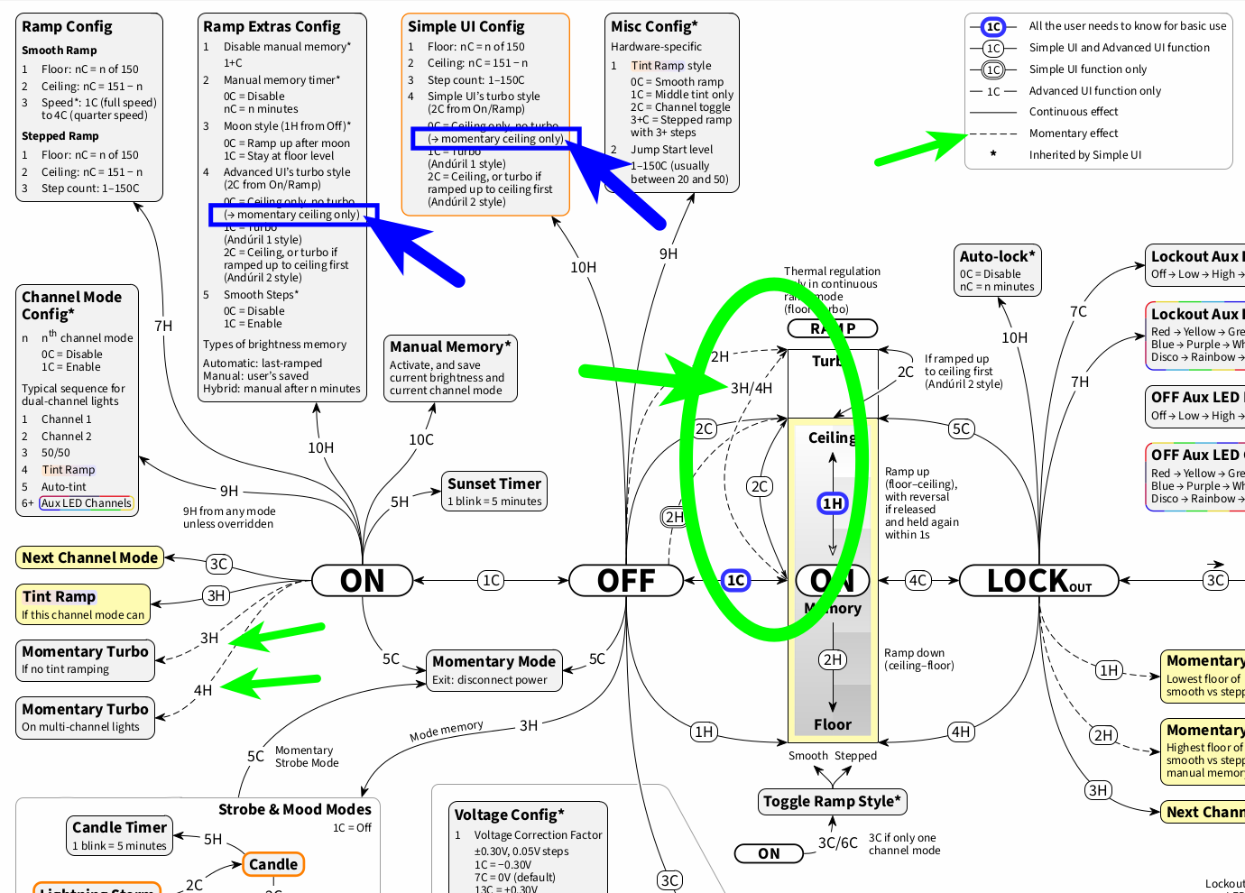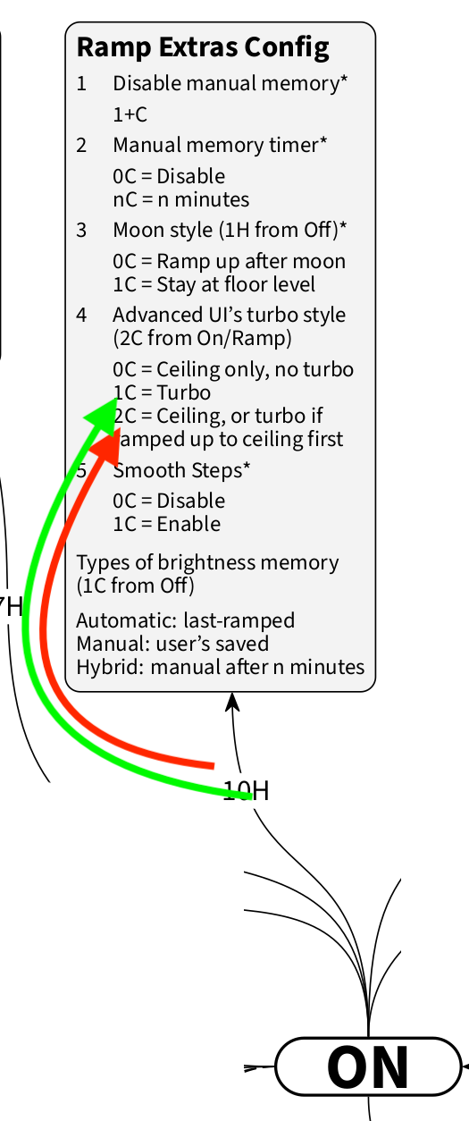 By the way, to try and address these kinds of differences visually, in the past I have created an exemplary model-specific diagram for model number 0135, hank-emisar-2ch (for example for Emisar D2), which displays Anduril 1 turbo style, Extended Simple UI features, and the model-specific default settings (for Anduril 2 release 2024-04-20 only).