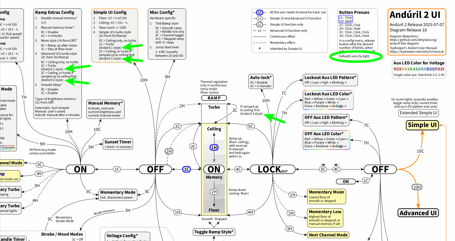 Based on ToyKeeperâs manual, the diagram now includes AndĂșril 1 style and AndĂșril 2 style for Advanced UIâs turbo style as well as for Simple UIâs turbo style; AndĂșril 2 style is now also included next to the ramp image for 2C for turbo in Advanced UI. This way, it should be easier to see what is going on with the turbo style displayed, or at least to know what Anduril 1 turbo style and Anduril 2 turbo style refer to.