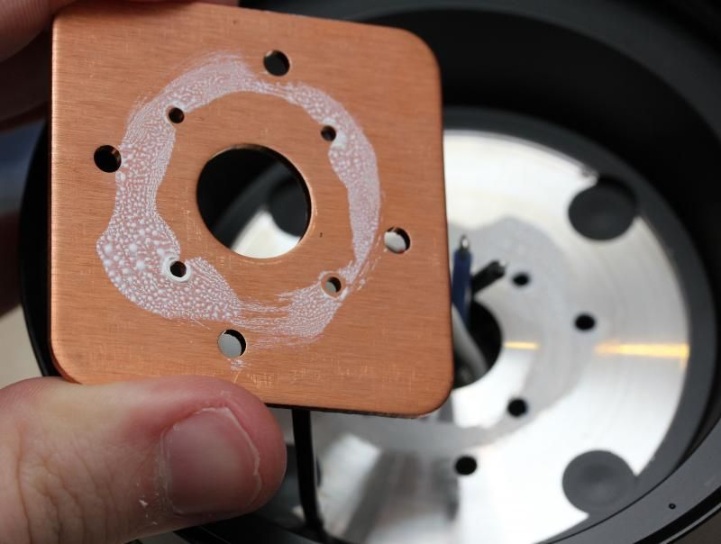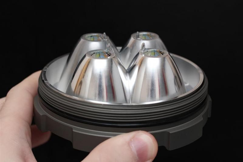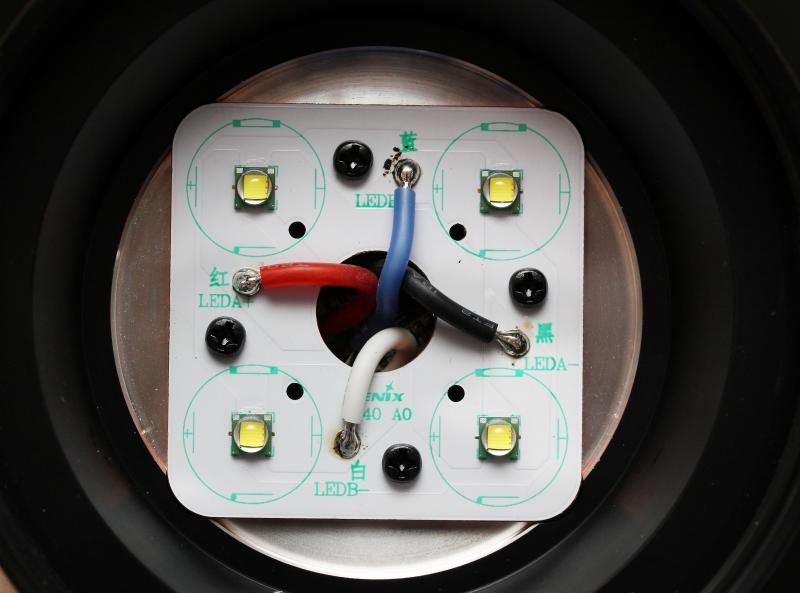Disappointing amount of thermal grease, but it did not matter. A 30 min max output indoor tailstand test without cooling only showed about 250 lumen drop. Which is natural heat sag when the hottest part of the light goes from around 23 C and to close/around 60C. Aluminium below emitters are not thick, but certainly adequate. The light is built like a lightweight where it can be (plastic high quality reflector, no excessive amount of aluminium in the middle of the "pill/head"). But in general its built like tank with massive heatsink fins, oversized wires, massive well secured copper mcpcb, etc...