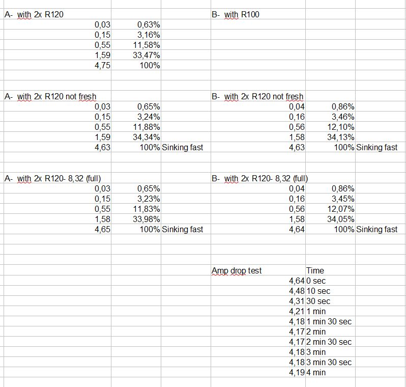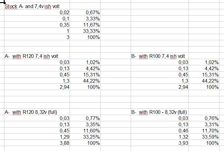 The notes below show emitter amps and mode spacing on the stock light with low battery voltage. Then you can see it with two different resistor mods. Which gave lower output due to low battery. Then I charged the battery, and saw around 3,9A to each emitter depending on the resistor value that was added.