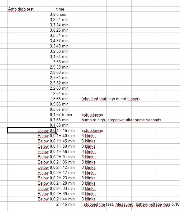 Ten minutes later it did another stepdown that was even lower (below 0,1A, not below 0,0 as my notes say:D ) It then did 3 warning blinks every 5+ minutes.