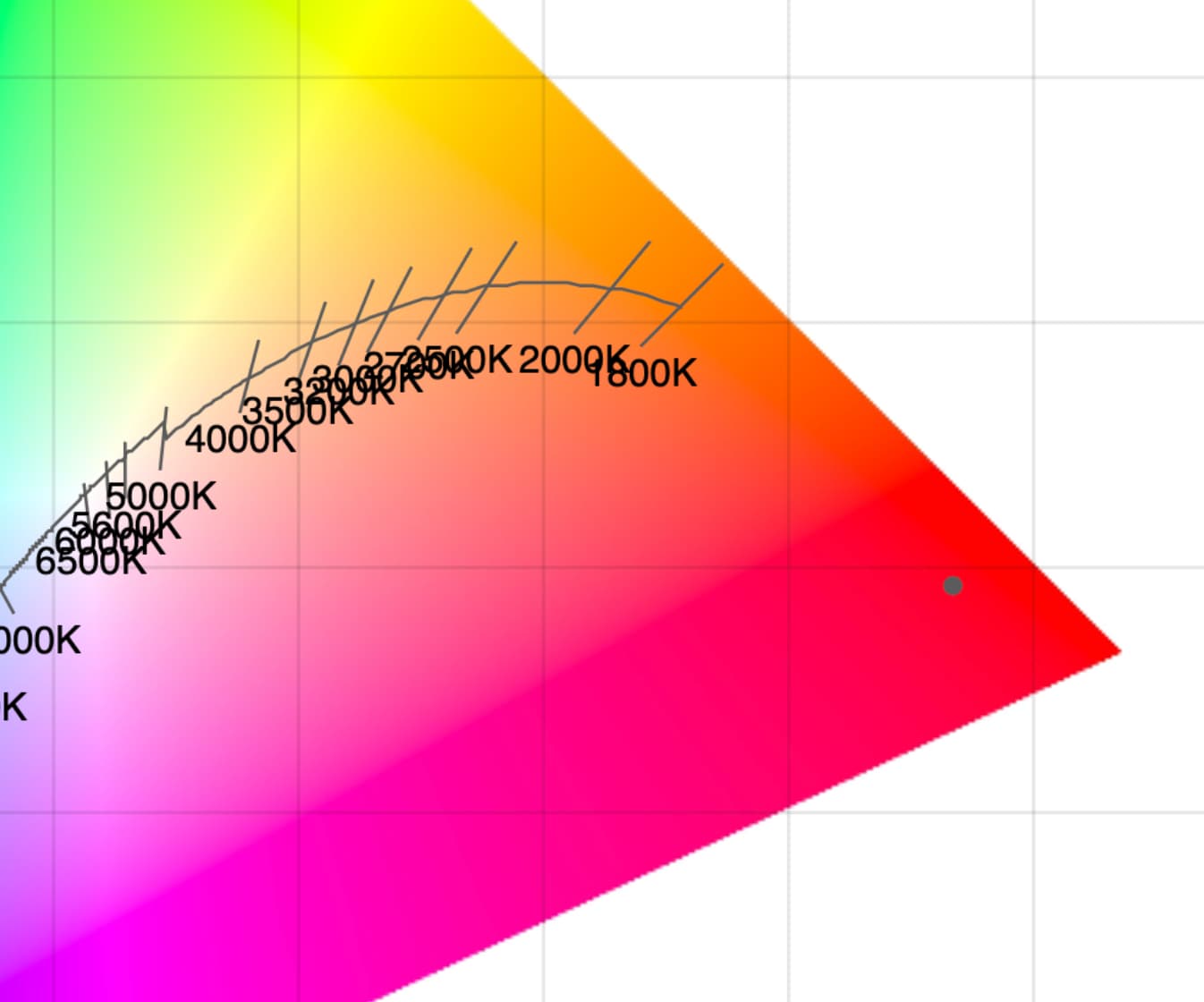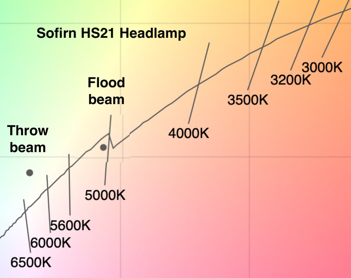- The White Throw LED combined with the Floody LEDs produce a combined beam of about 5900K CCT, w CRI 76 and Tint DUV of 0.0063. The low mode of 1.8 lumens is suitable for illuminating the ground near our feet, or something in our hands or on a table.