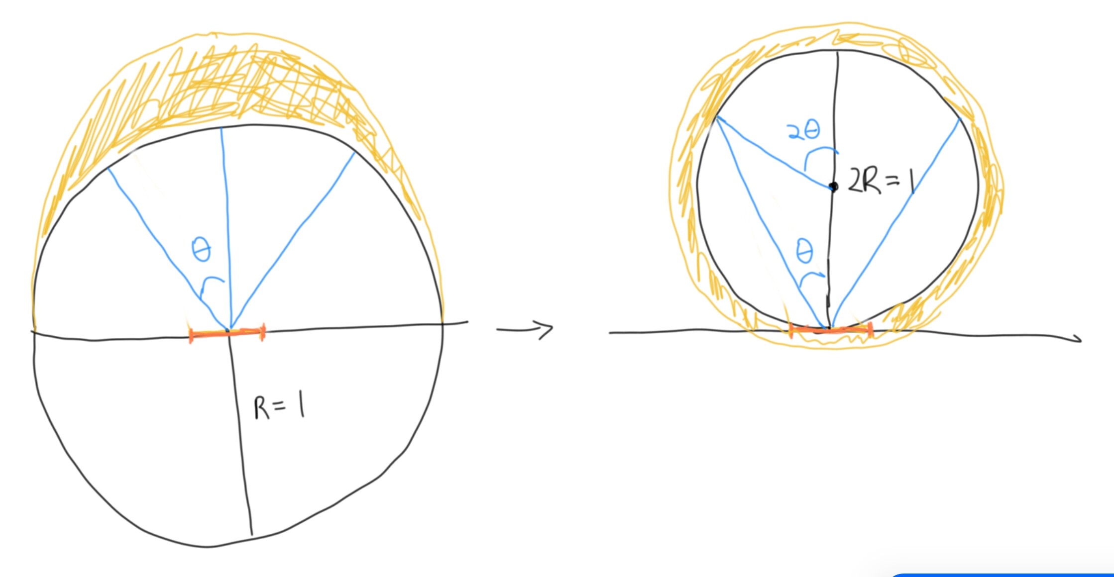 Pictured as black circles are two spherical surfaces one can try to integrate over, the latter in front of the emitter and having half the radius of the former. Blue is the spill cone, and the filled-in yellow represents intensity on the surface. Orange is representation of the Lambertian source.