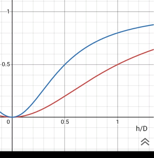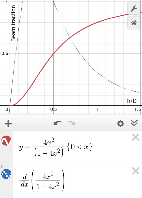 I wondered how that compares to your calculation and used h/D = 1/S in the plot below (yours is red, mine is blue, x is h/D, y is the beam fraction)
