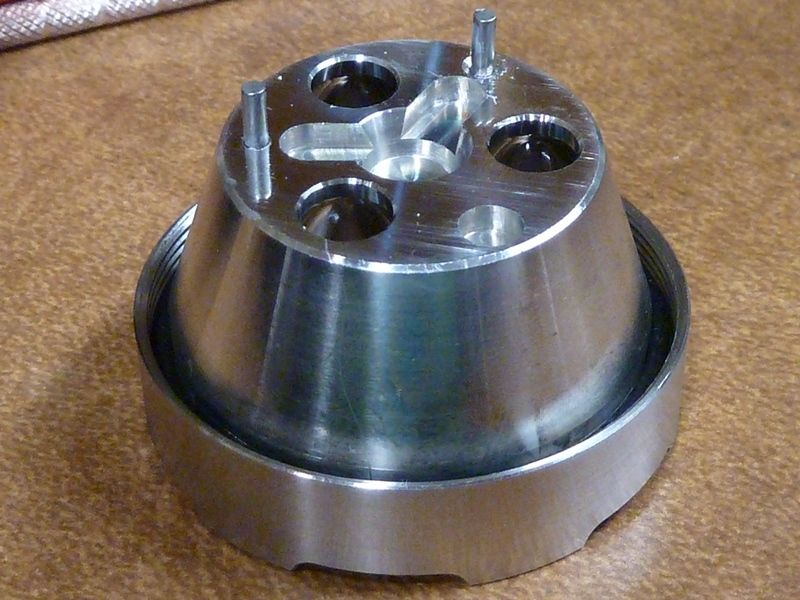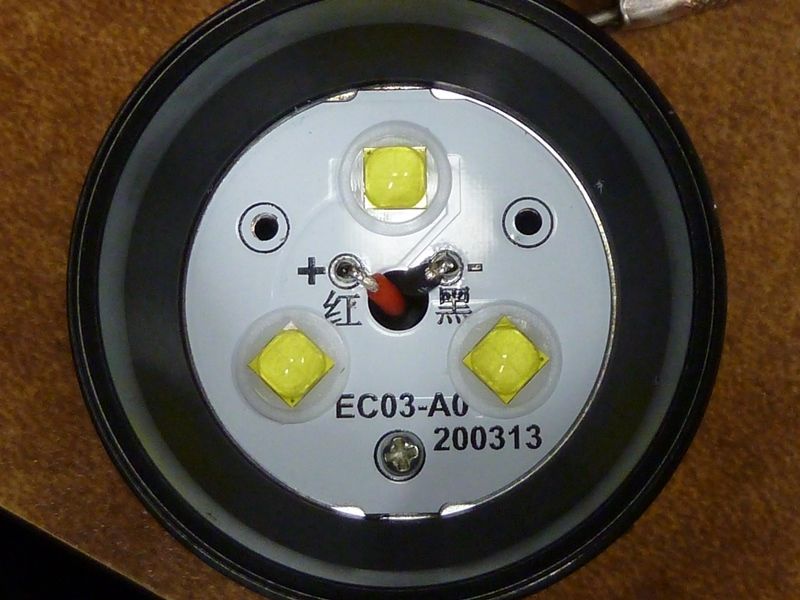 Got a surprise here - no screw inside the pill as I thought there would be. Don't think I've seen a multi-LED reflector setup like this before, but I like it. No screw inside the pill like a Q8, one screw holding it down and 2 alignment holes for pins on the reflector. So the MCPCB is kept down tight (should anyways), and no problem twisting the reflector. Also I like the machined cutouts for the screw head and wiring connections - I used to do that machining myself on Shocker reflectors.