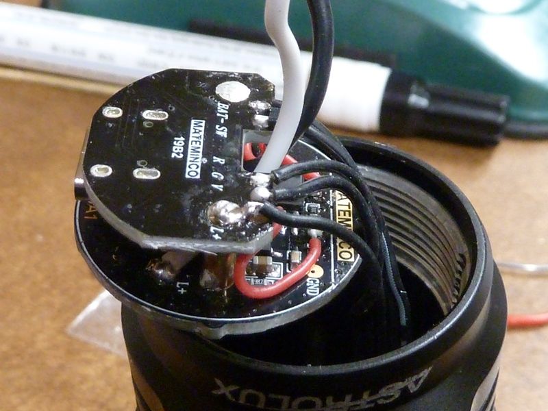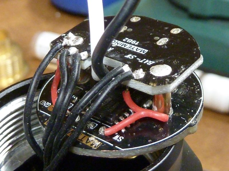 It's got a 5 wire harness going to the switch (Batt+, Batt-, Red, Grn, Switch) - no idea why Batt+ is needed. 2 boards - the contact board id the LED driver, and the piggyback board is the USB-C charging: