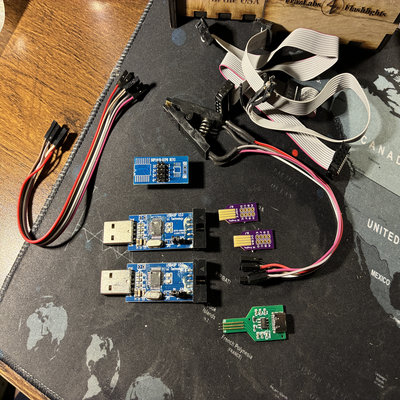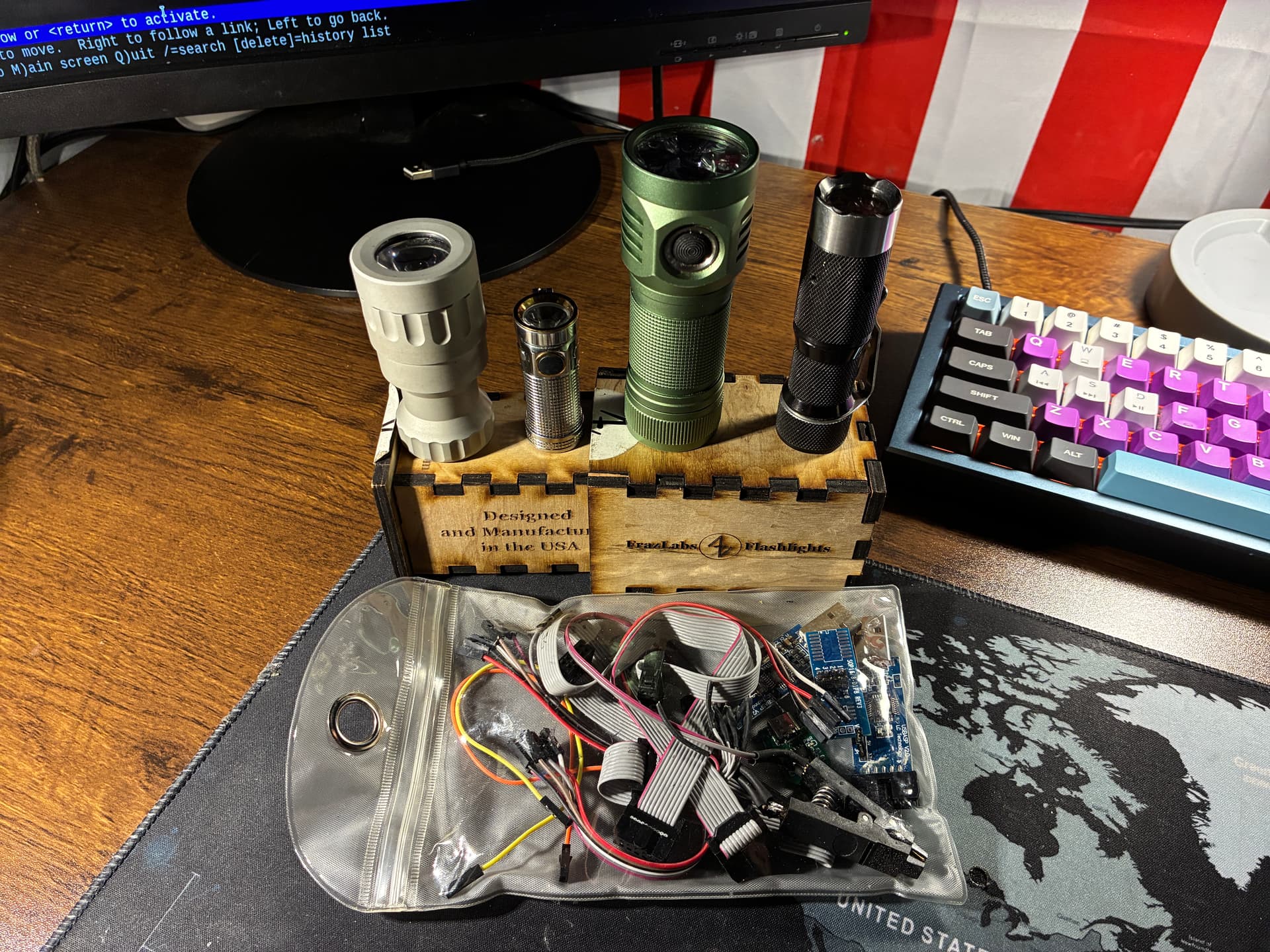 Green with green aux and SST-20 4000k emitters. Was flashed with the latest version of Andruil 1 shortly before 2 was rolled out. I am told by folks who are quite a bit smarter than me that it can be flashed with version 2 if you want it. It is in pretty good condition as well. Few dings and dents along it’s life as a flashlight but nothing too serious. Pics should be good enough to show it’s true condition. Not a shelf queen but not a beater either. Someone, I don’t remember who gave me a bag of these programmers and cables. I do not know if they would be used to flash this light or any light for that matter but you are more than welcome to them. No extra charge.