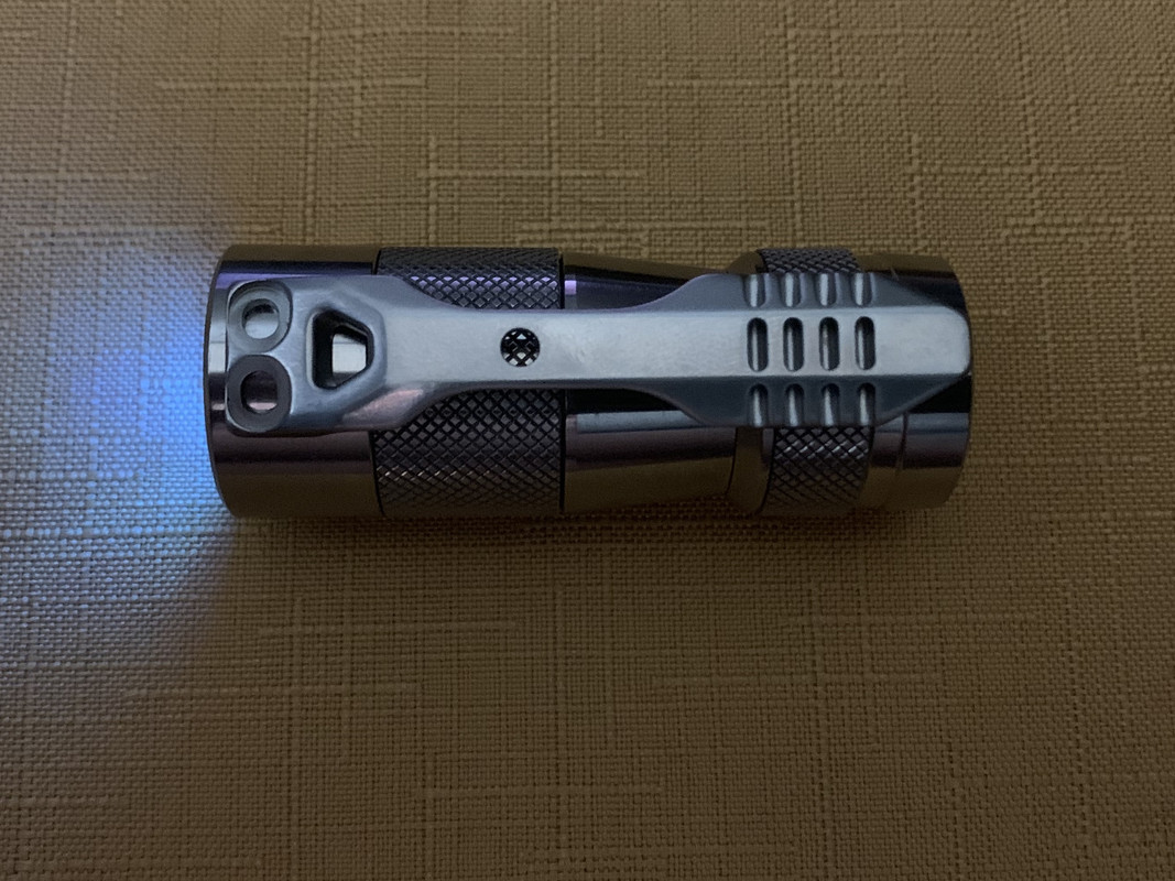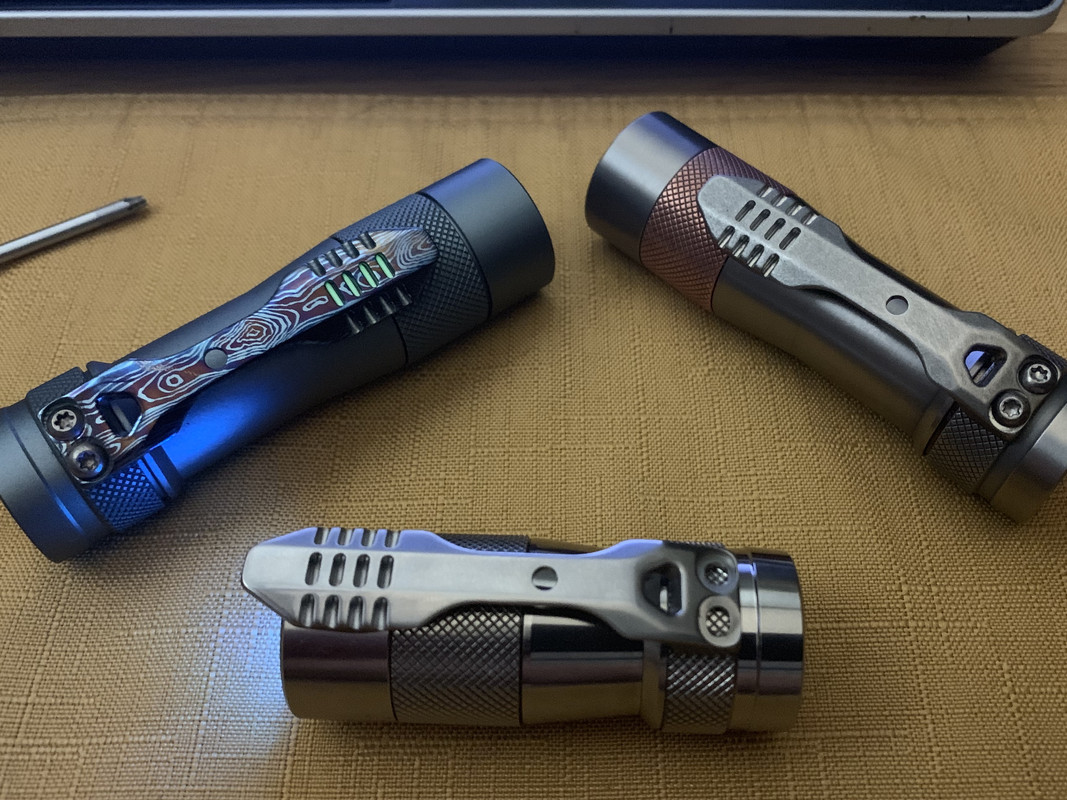 Stone wash Ti clip on Brushed Ti/Cu FW3….Polished Ti clip for the mini… kicking around idea’s where/which end to mount and or modify the clip?