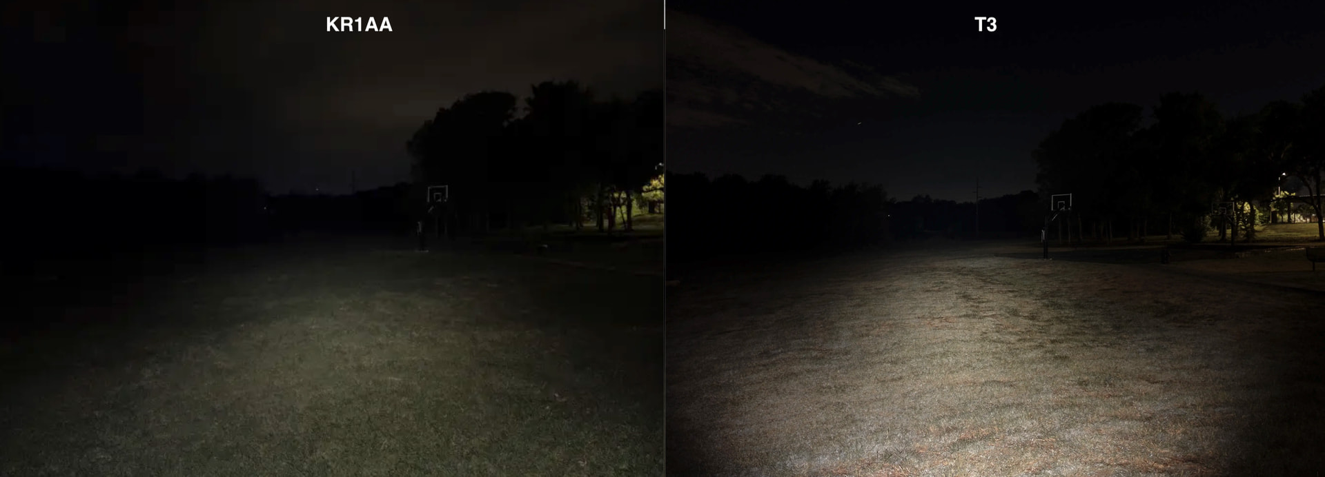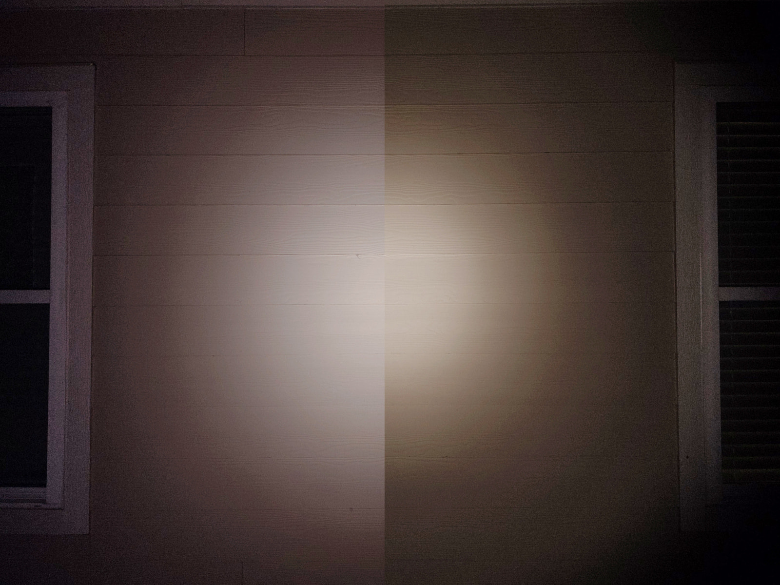 The beamshots with the draggable A/B slider weren’t quite the same size, so I resized the set with KR1AA NTG50 4200K vs Convoy T5 519A 15W. This makes it easier to compare the beam shapes. KR1AA (left) has a bigger LED with a wider/floodier beam, while Convoy (right) has a smaller LED with a narrower/tighter focus.