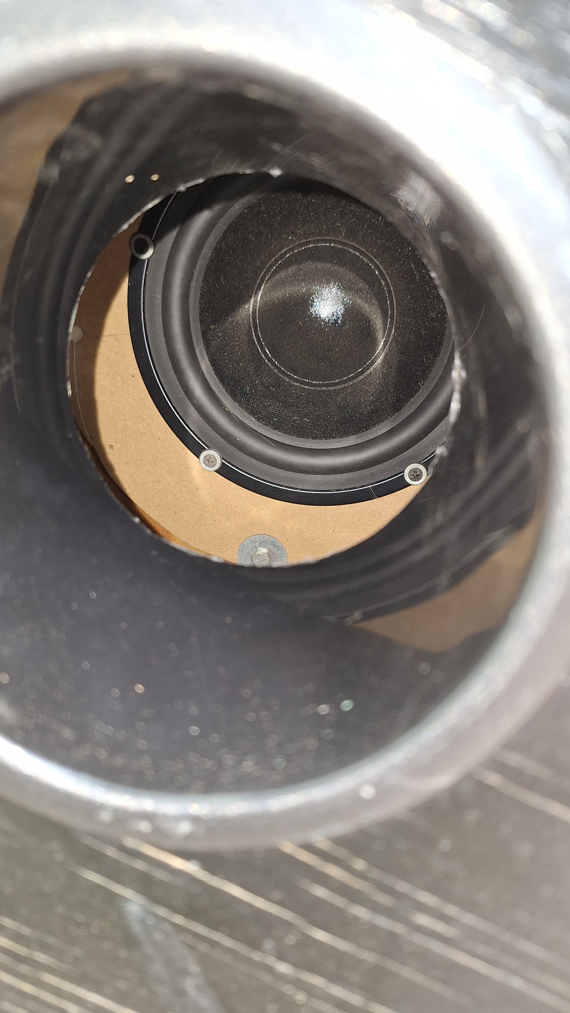 Considering the weight of this sub woofer system, 90 plus pounds, a stand needed to be substantial, sonically enhancing and aesthetically appealing. The whole speaker rests on ‘donuts’ attached to a ring that fits to the inner diameter of the pipe.