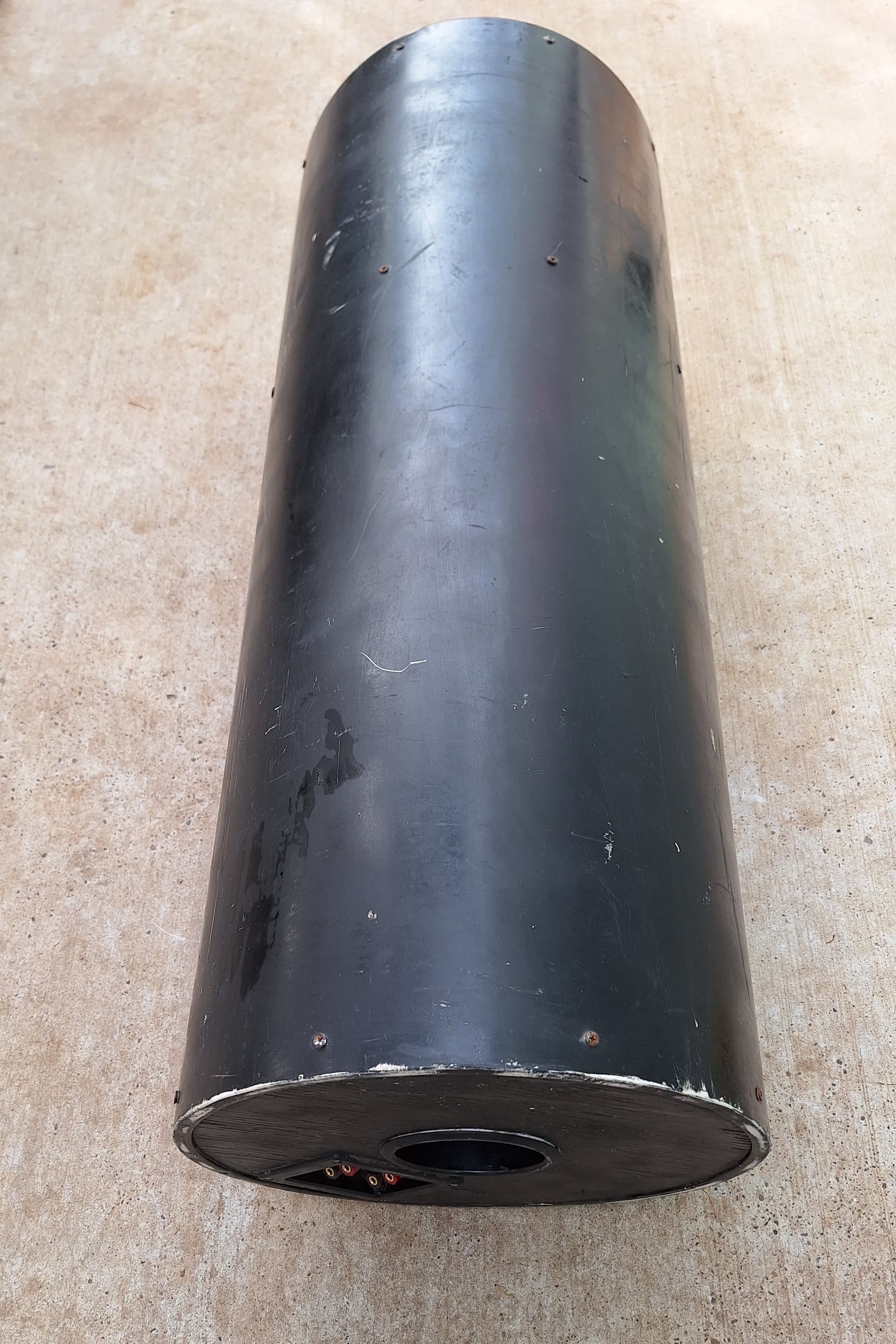In 2003, I developed a new design (really to match my satellites) and decided to build the new system around an Infinity Kappa Perfect 12.1, DVC subwoofer. The driver has an aluminum cone, butyl rubber surround, a cast metal frame, a vented voice coil and rated to play down to 20 Hz at audible levels. Substantial! The enclosure is principally a 16” diameter PVC pipe with an internal structure affixed to mount the heavy transducer. The following photos demonstrate the construction: