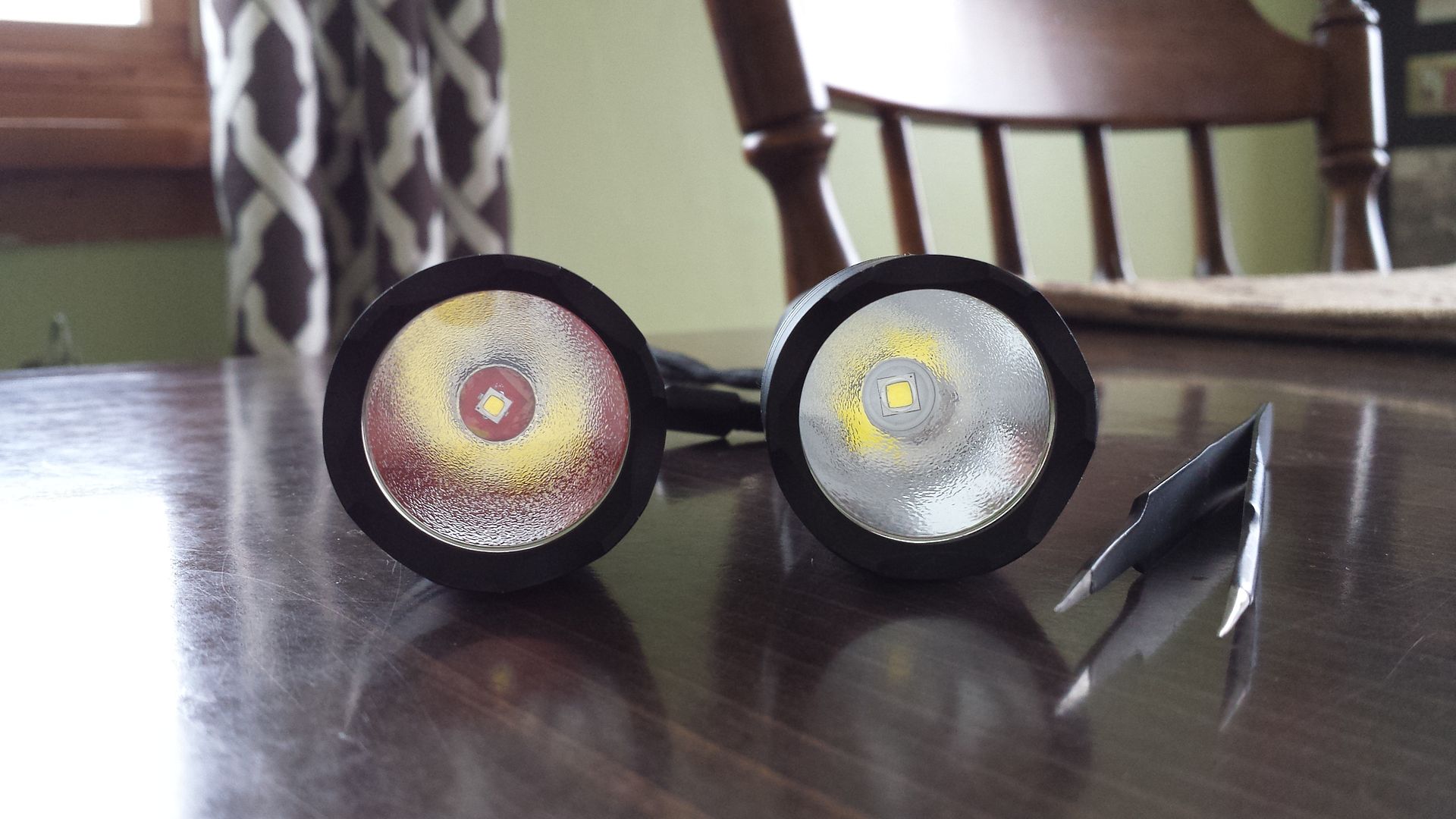 So it's like I thought, there isn't a huge difference between the XM-L2 @ 3A vs. the XP-G2 @ 2.2A (yes, there still is some difference). I'm surprised the XM-L2 seems to out throw the XP-G2, though the XM-L2 needs to be driven harder to do so. Also consider that the XP-G2 is driven @ 0.8A less current, so more runtime. I'm very pleased with both beam patterns. The XP-G2's tint is a bit too rosy for my taste though. The 4C of the XM-L2 also came out warmer than I expected (I usually prefer a 5B1 tint) and is about perfect I think.