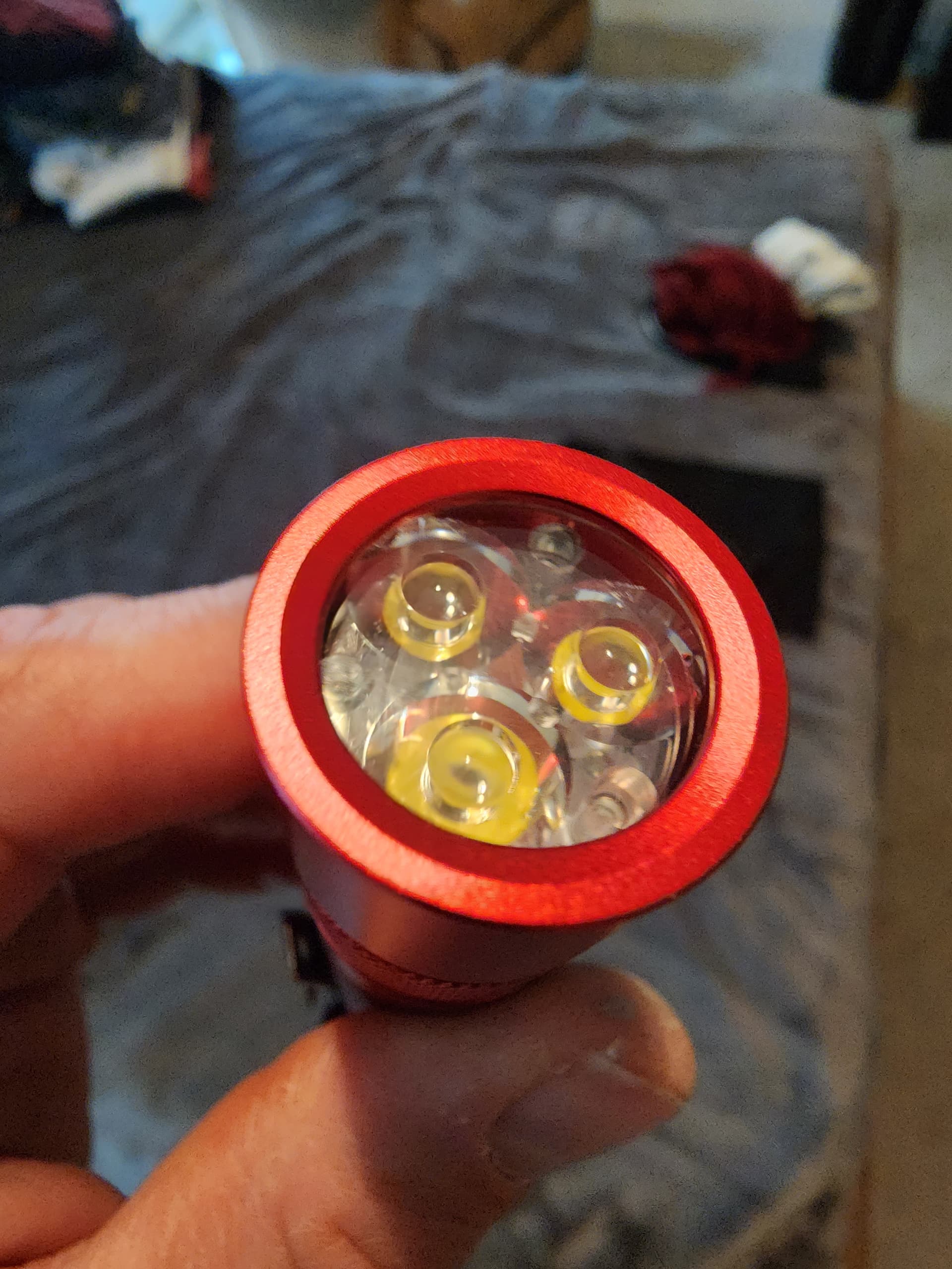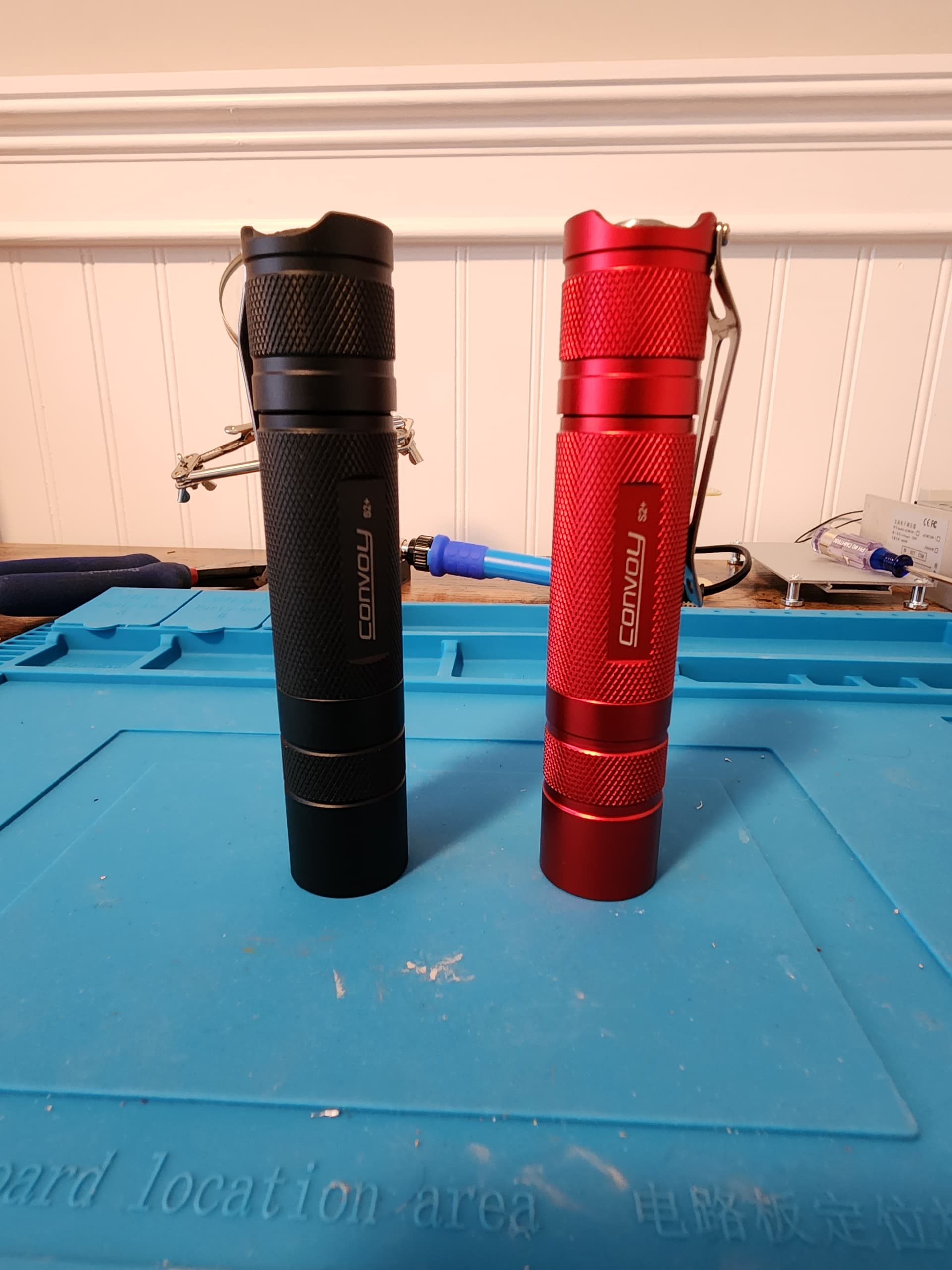 Black one is an XM-L2 6500k, red one is a triple XP-G3 5000k.