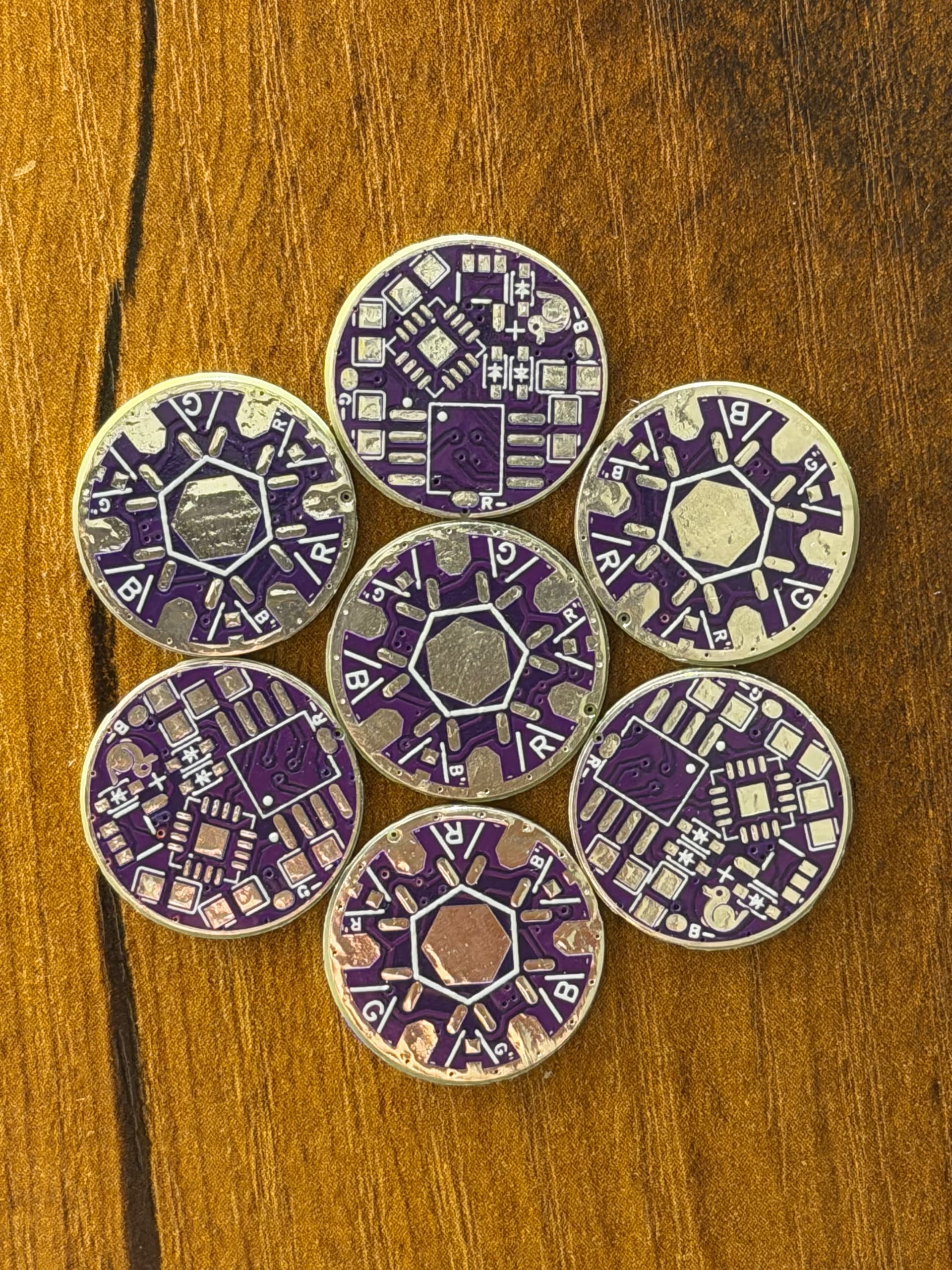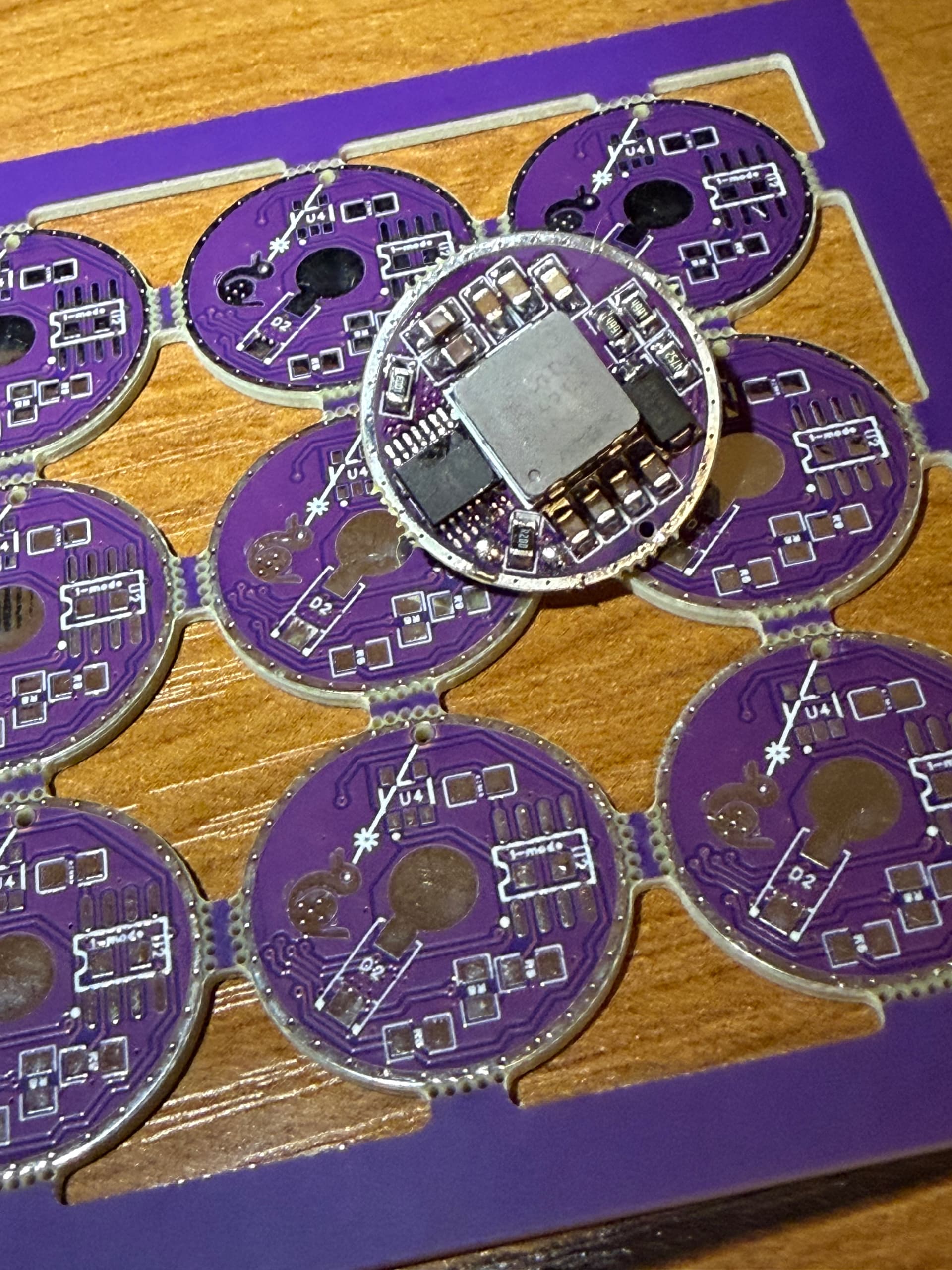 Put the project on schematics using 3 channels of 2x7135 IC’s connected to a Attiny85 for generating the PWM signals and then many nights trying to fit everything in a 17mm disk PCB: