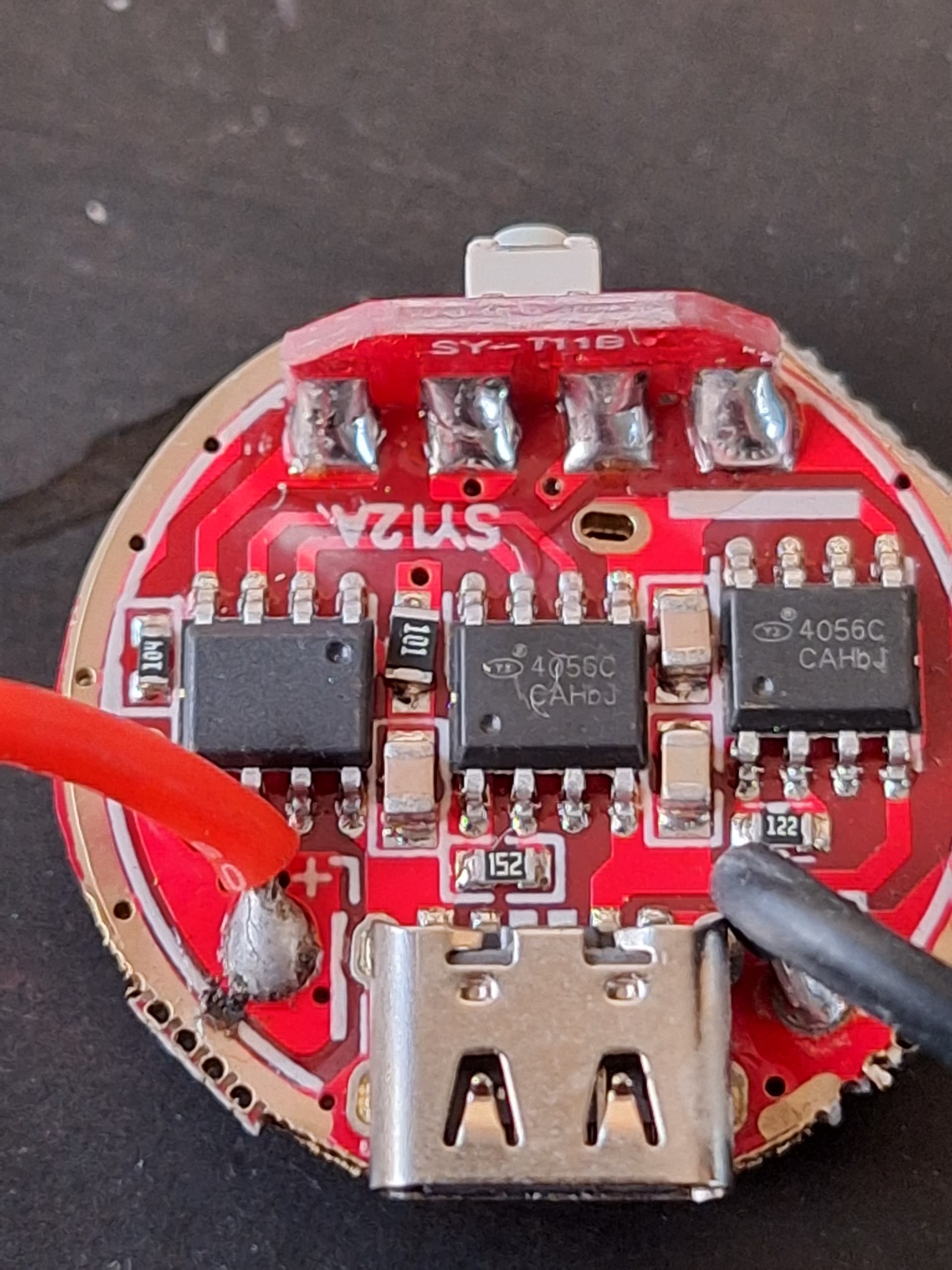 -The ‘upside’ of the driver has 2x 4056C chips, which should be li-ion charging chips I believe. The only reason I can think of that they used 2 (identical) charging chips, is that each of them only charges at 1A, so maybe 2 in parallel to get 2A charging? (Correct me if I’m wrong!)