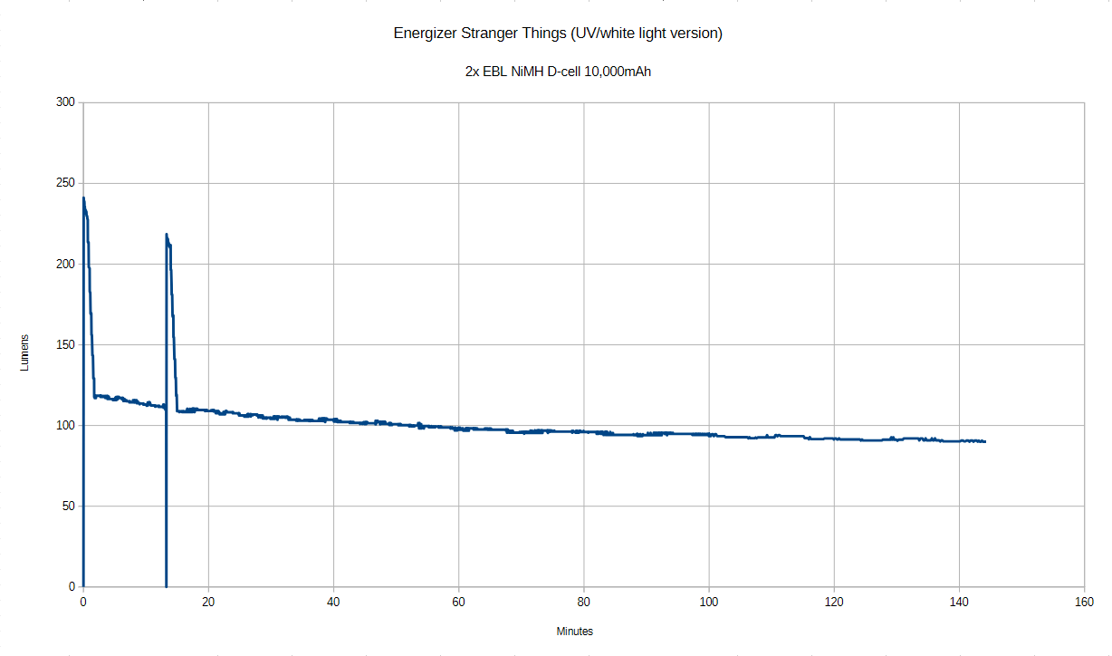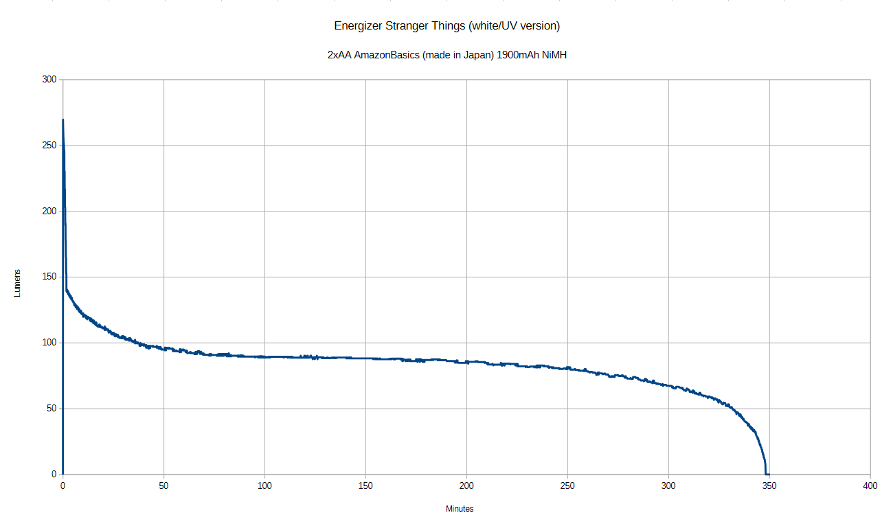 To get the rest of the annoying aspects out of the way, I was prepared to do a reasonably long runtime test, I was thinking like 6h maybe (Energizer claims 7h, but often alkaline run longer because they drop in output so much sooner). When I saw that in under 2 minutes, the output was cut in half, I knew it would be a long test that I was unlikely to have the patience for. So I didn’t feel too bad when I had to stop the test early. And given the pain of recharging I doubt I will attempt it again. I might try it with two Eneloops since it will be shorter.