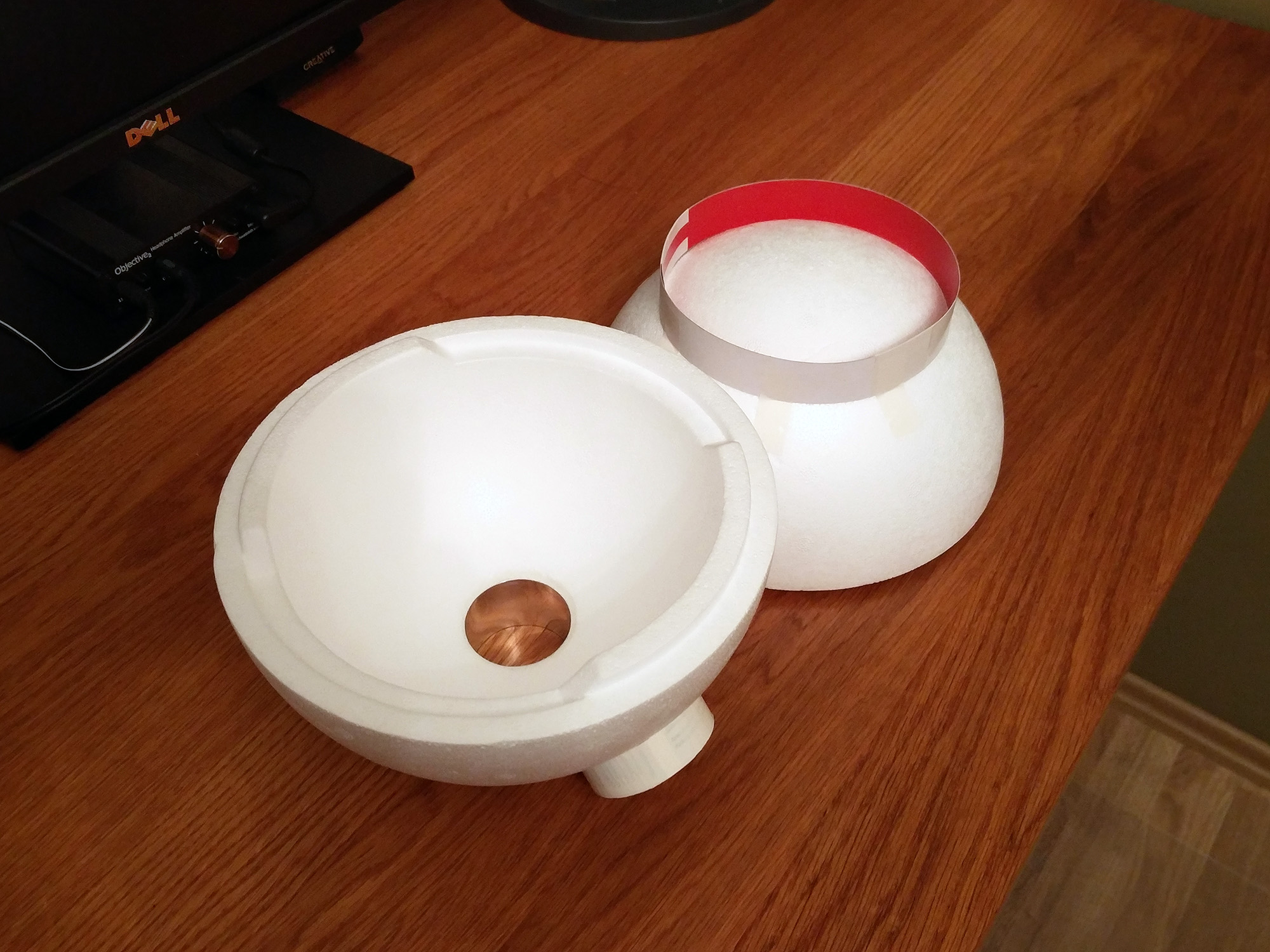 Glad I stumbled on this thread. Great work Djozz! Looks like I can locally pickup (2) 12 inch half balls @ $8each. Question, with a 12 inch ball (30.5cm), what's the largest size hole I could use and be within reason for decent results? Can I go up to 75mm? (i.e. for a Courui?) My use would be for bike lights which could also involve shapes that are not round (more oval).