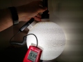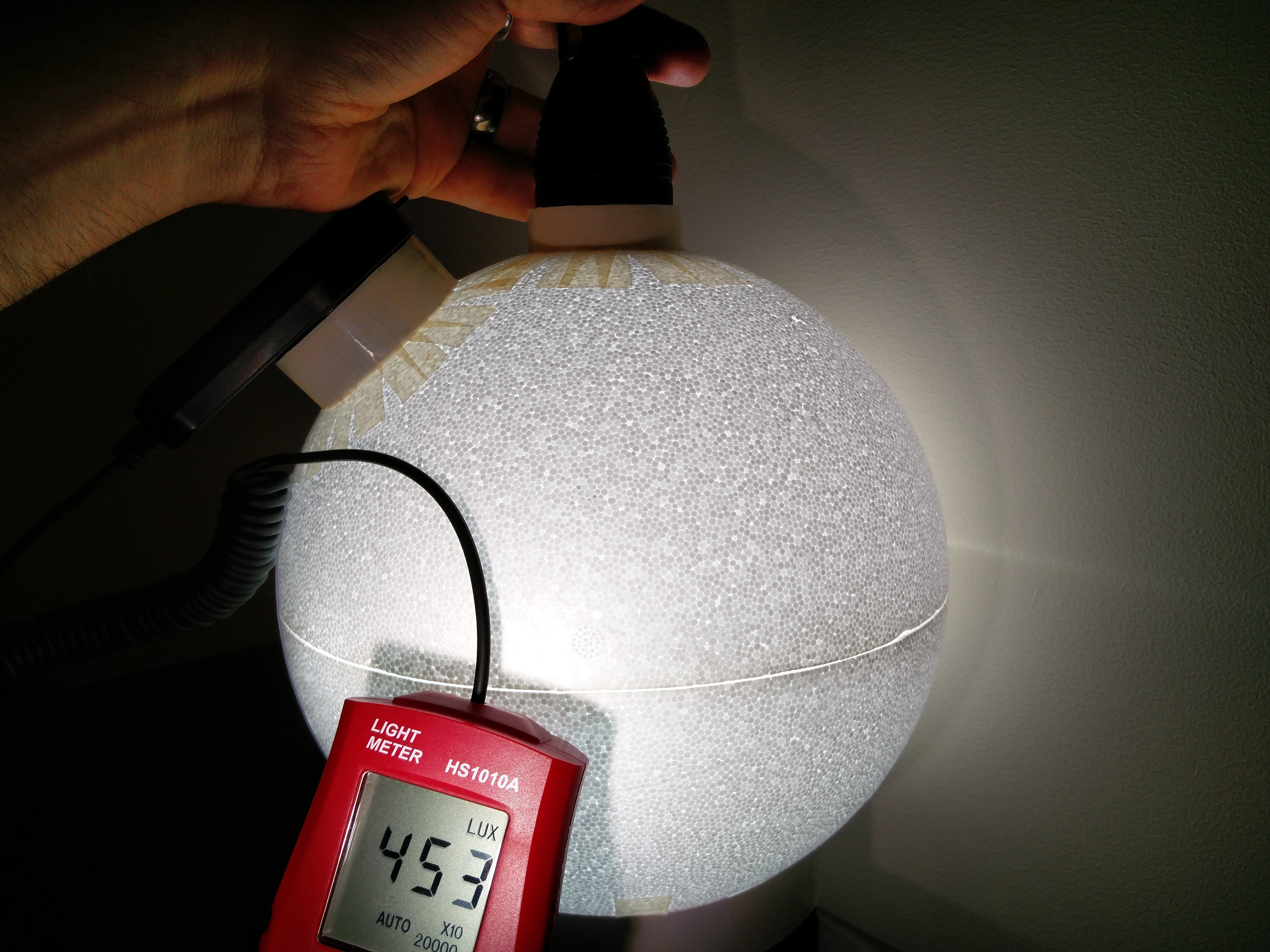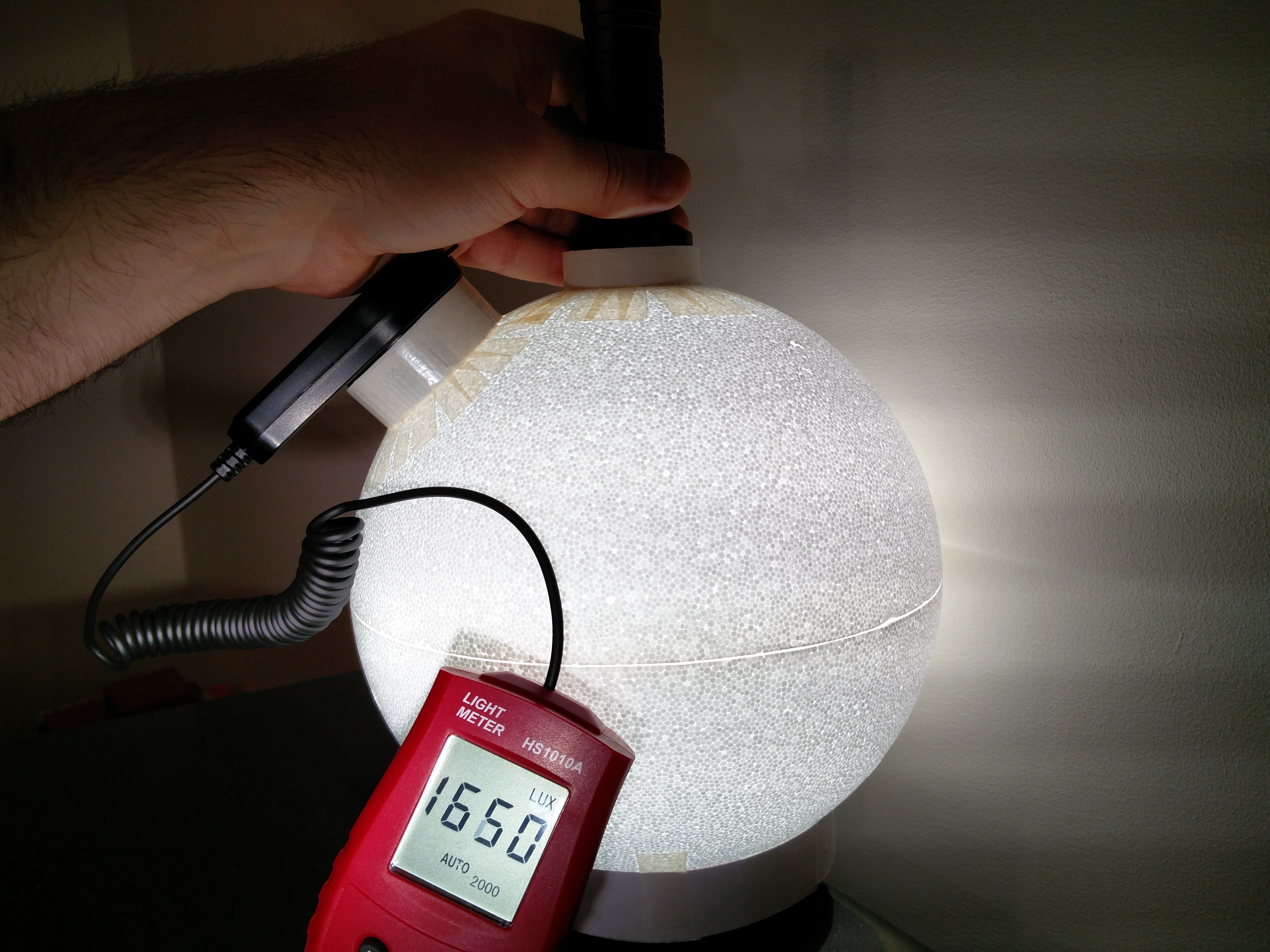 I repeat this because someone above made a hole for the luxmeter also: do not make a hole for the luxmeter, the light is measured through the styrofoam in this design. The design of the OP assumes a wall thickness of around 2cm, this reduces the amount of light reaching the luxmeter enough to get the lumen-measurements into a workable range.