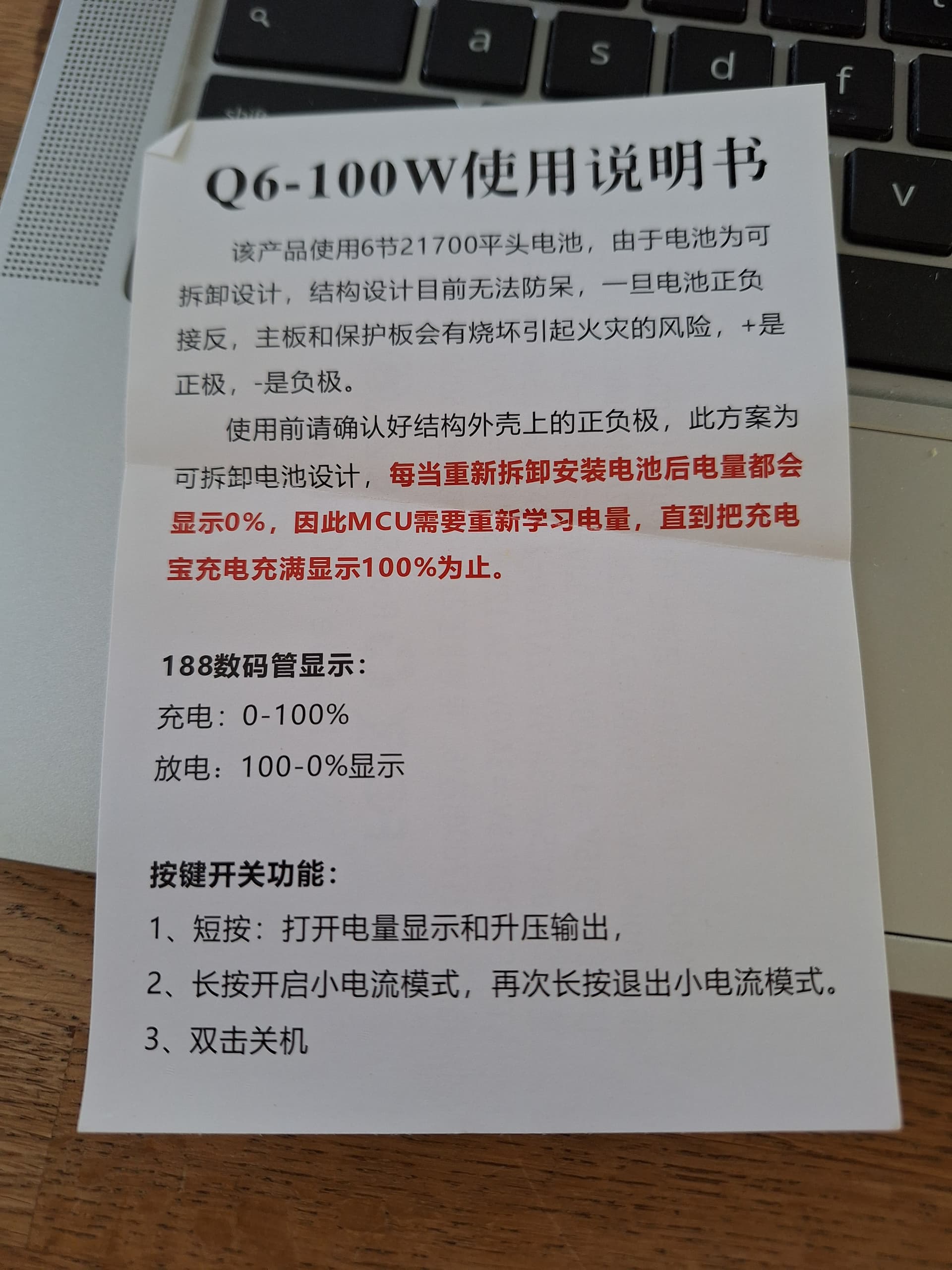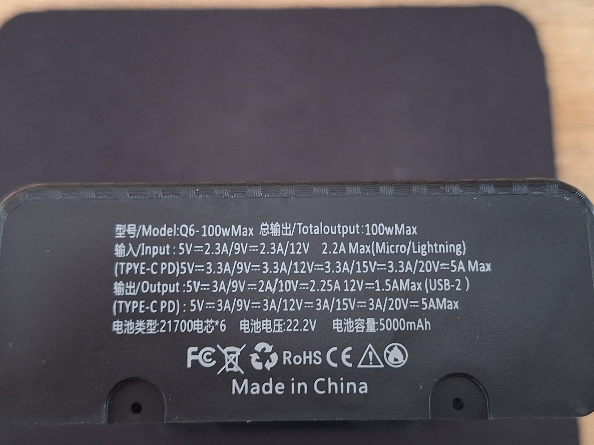 The other thing that I find really interesting is that it can output up to 100w (20V/5A), but also can be charged with the same voltage! Combine that with 6 good quality 5000mAh 21700 and you seem to have powerfull power bank with (at least) known good quality cells!