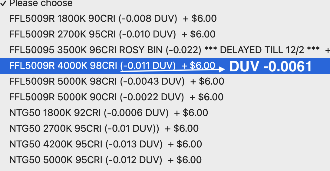 as an example, the NTG DUV from Opple 4 is -0.0130 but I have seen a more accurate spectrometer report that as DUV -0.0086.. Take that with a grain of variation.. I cant guarantee what your FFL or NTG LED will look like other than it will not have Green Tint (above DUV)
