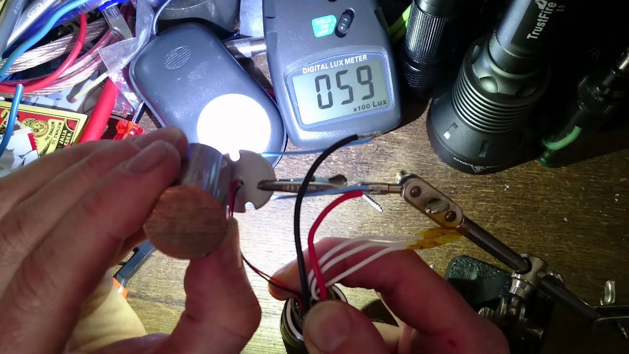 Nicely, a stepdown to medium happened when the ledboard got too hot. Even further stepdown followed when even medium setting was too high (as this bare board has no heatsink whatsoever), then as the temperature went down again, the led output went up again. Well done! In an actual flashlight all this will be slower of course as there is actual heatsinking present then. But I'm quite impressed that this set-up actually saved the old XM-L led on a non-DTP aluminium board floating in air!