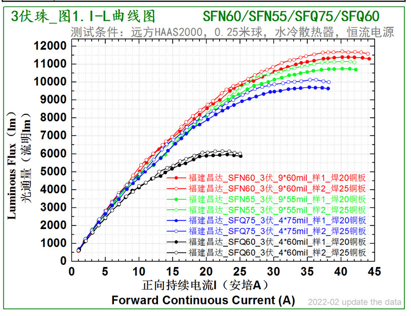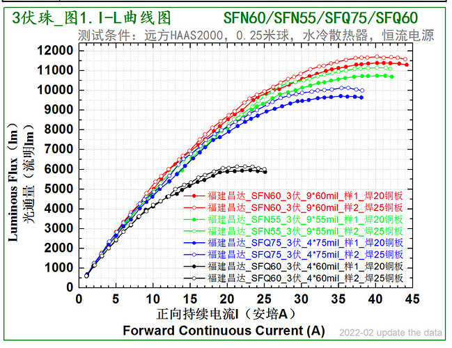 The lumen readings in this chart seems way too high. I got around 9000 lm for SFN60 cool white at maxium of 30 Amps. We are talking about a huge difference which would be clearly noticeable in my measurements and setup…