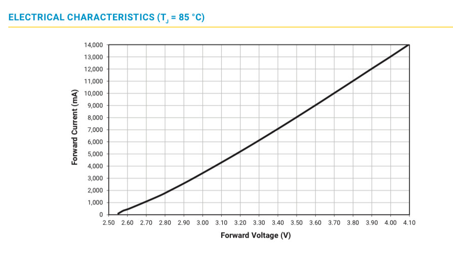 - Maximum reached at 13 A, at this point 3339 lm @ 3.62 V