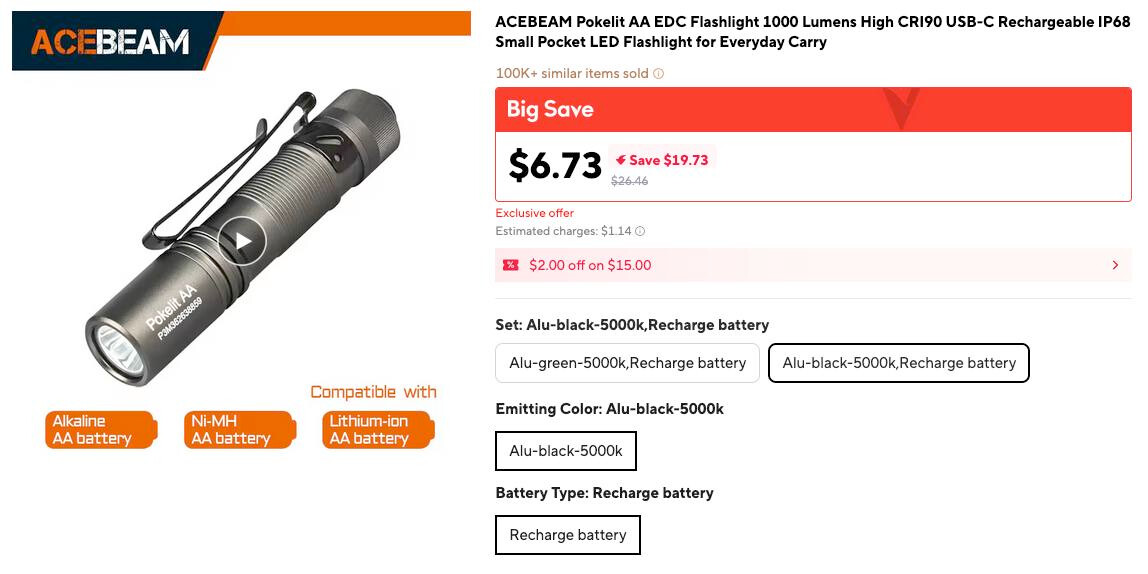 [̲̅=LMX=] Crazy deal: Acebeam Pokelit AA $6.73, TAC 2AA $11.86