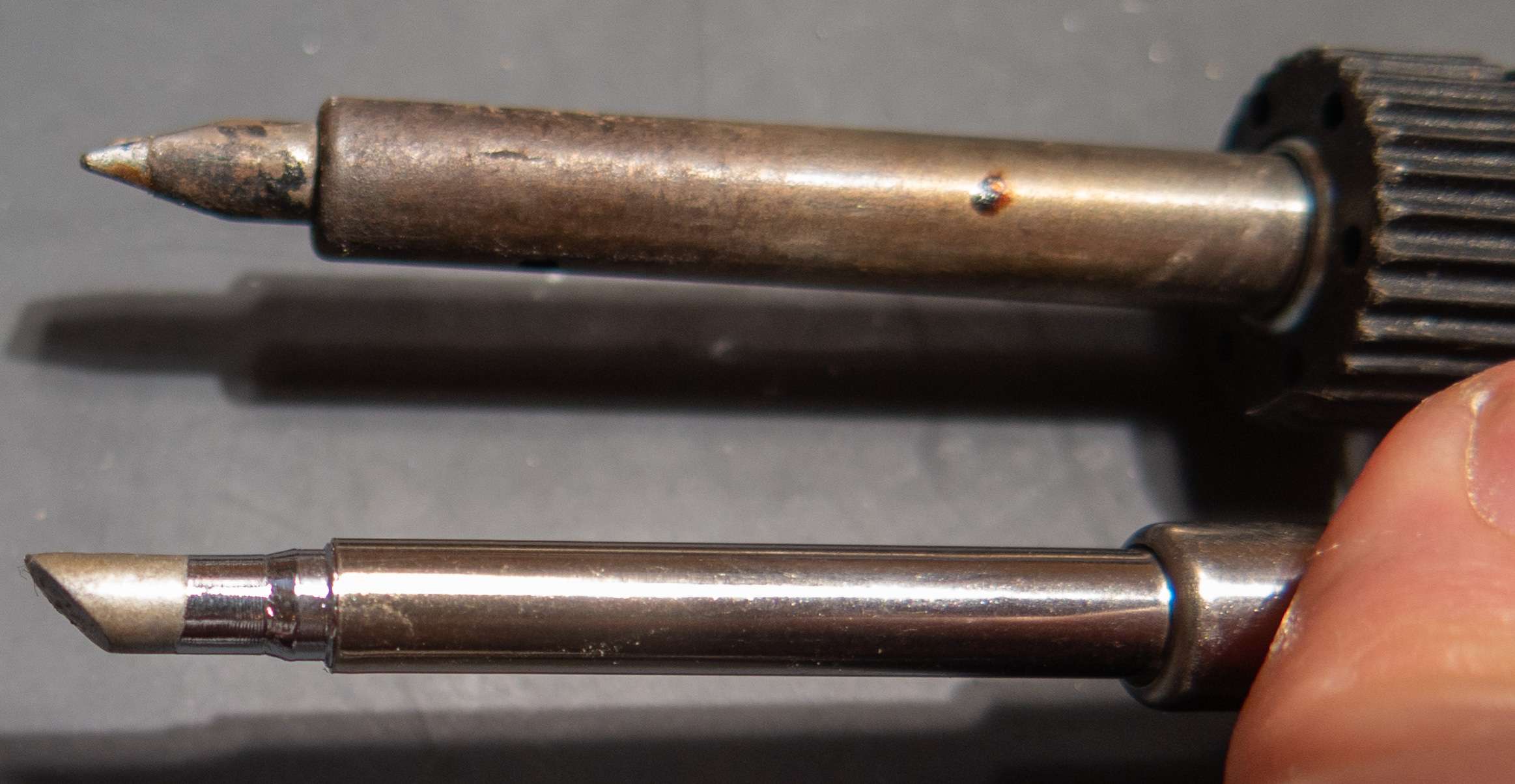 old and new MCPCB soldering tip, the flat one still works best in an assembled light where you cant get in a 45° angle to it