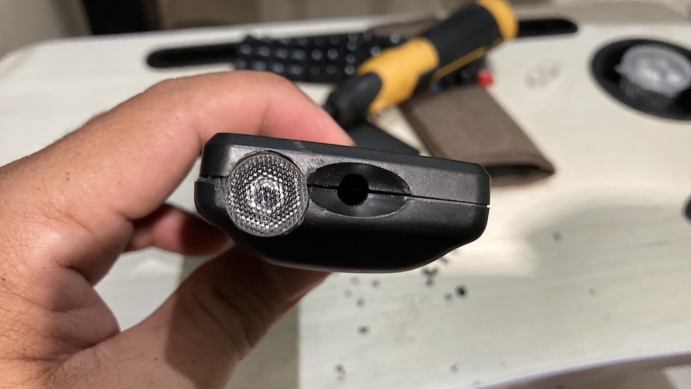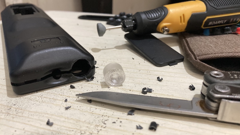 Then I continued with drilling a hole on the remote control’s body for placing the optic. I’m using a small rotary tool and knife as well.