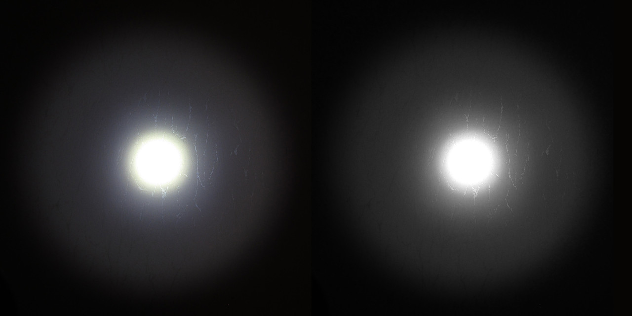 Those were both examples of side-by-side beam shots showing cases where the only thing changed was the surface texture of the reflector. Each pair is the same light, same LED, same camera and settings, same reflector shape overall… but one had a smooth surface while the other had an orange peel surface. And I made sure to only use examples where the beam was well-focused and had no major artifacts. The idea was to isolate changes to only one variable, to better demonstrate what that variable does. The pictures show a pretty decent representation of what I’ve seen personally when swapping reflectors in an individual light. Some lights have come with an option of SMO or OP and I got both, though after doing that a couple times I stopped getting the SMO option because I found OP consistently gave me a beam I liked more. In general, SMO provides a slightly brighter hotspot with slightly more throw, and sharper edges between parts of the beam. OP provides a slightly dimmer hotspot with slightly less throw, and different parts of the beam are more blended together. Outside of the hotspot and corona area, there is no difference between the two. The reflector texture only affects those parts of the beam.