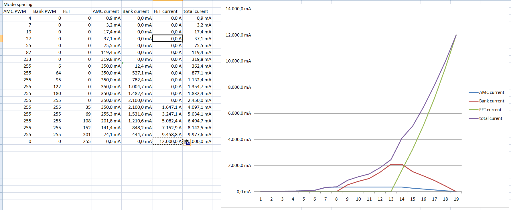 Out of curiosity, I made an excel chart of PWM values for 1xAMC, allAMC and FET. I have drawn the average value for each mode.
