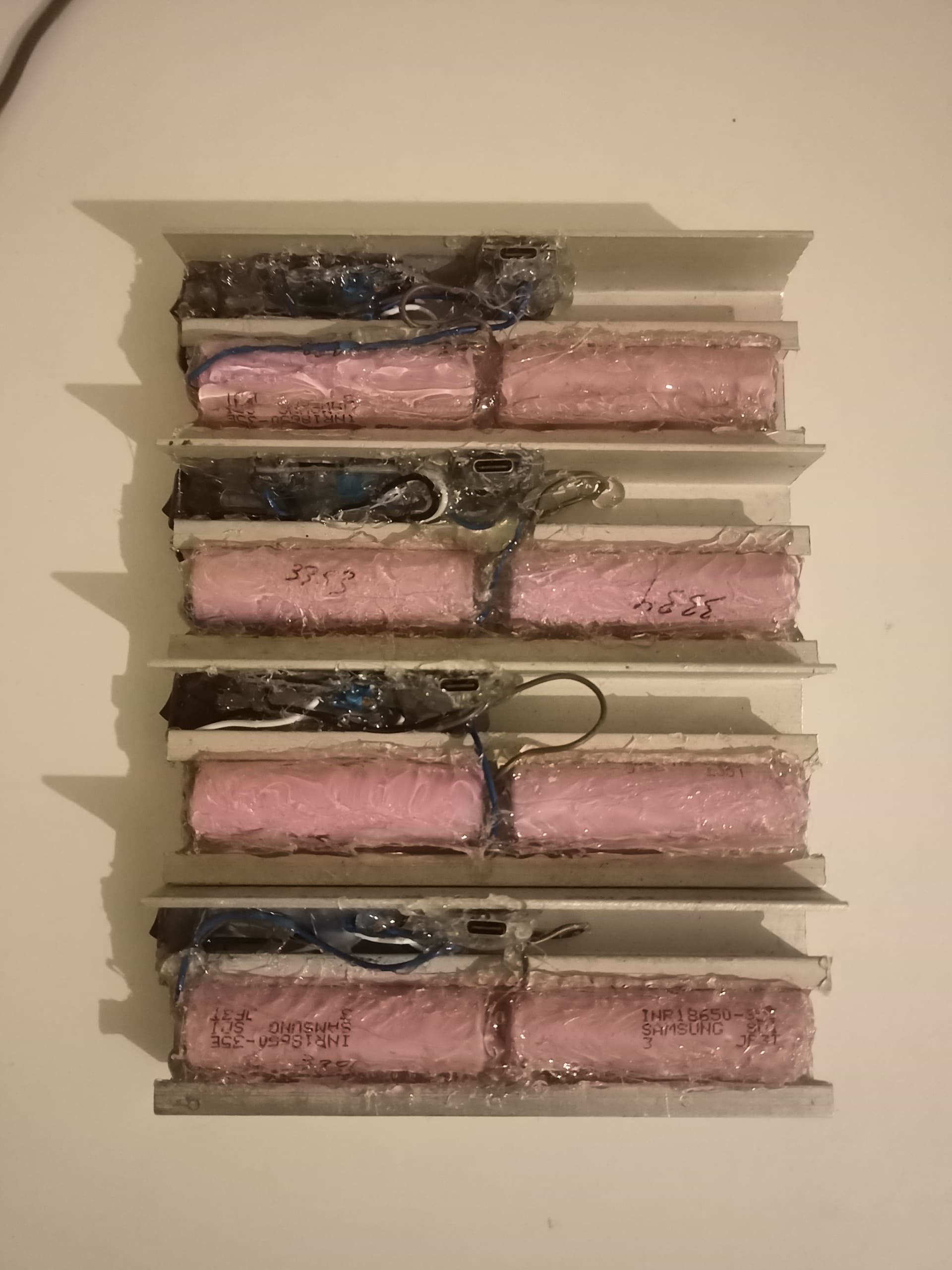 Bought 8 used Samsung INR18650 35E for ~2$ each, connected in parallel.