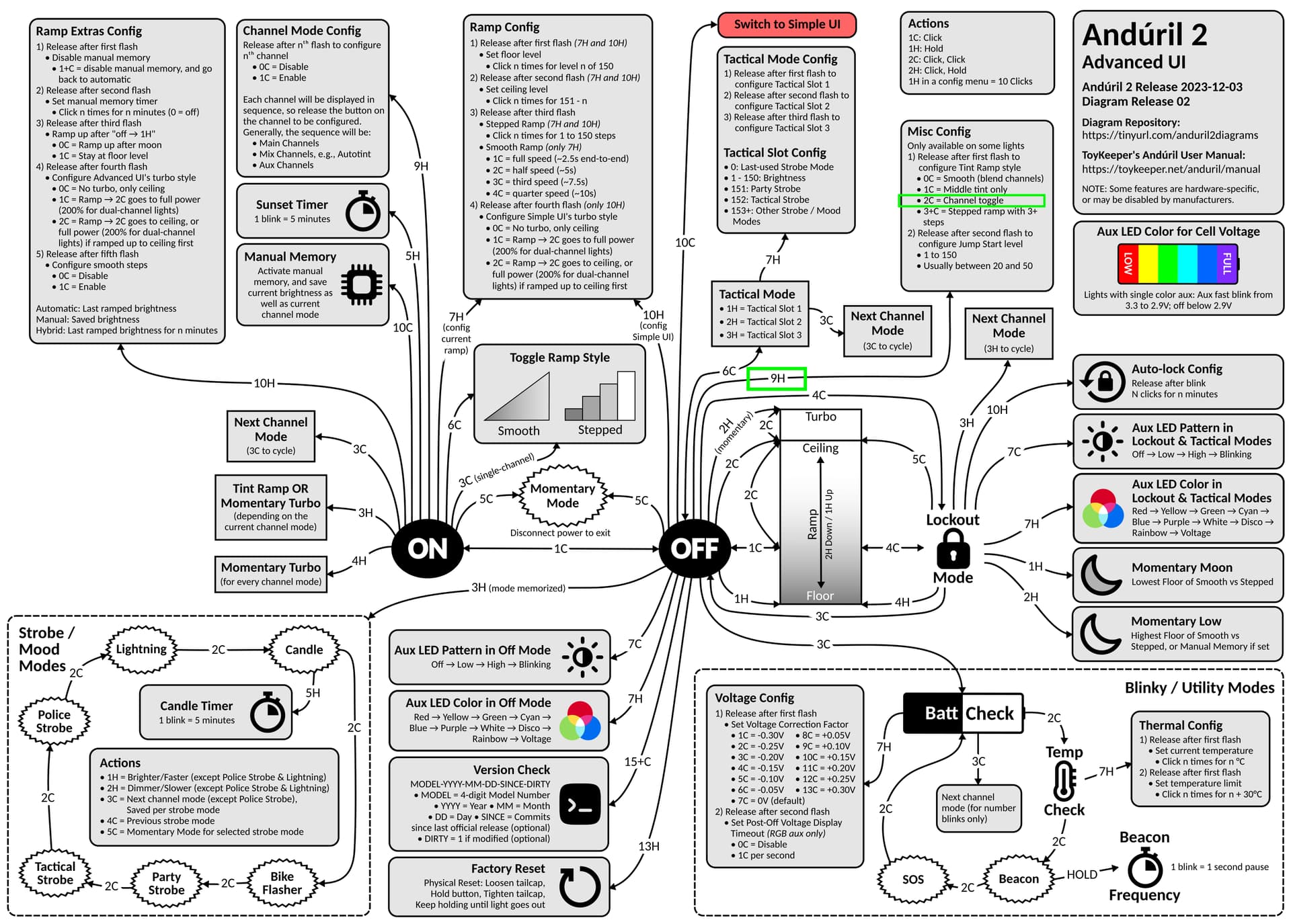 A diagram corresponding to this Anduril 2 release can be found here. This might help you to navigate the latest firmware version.
