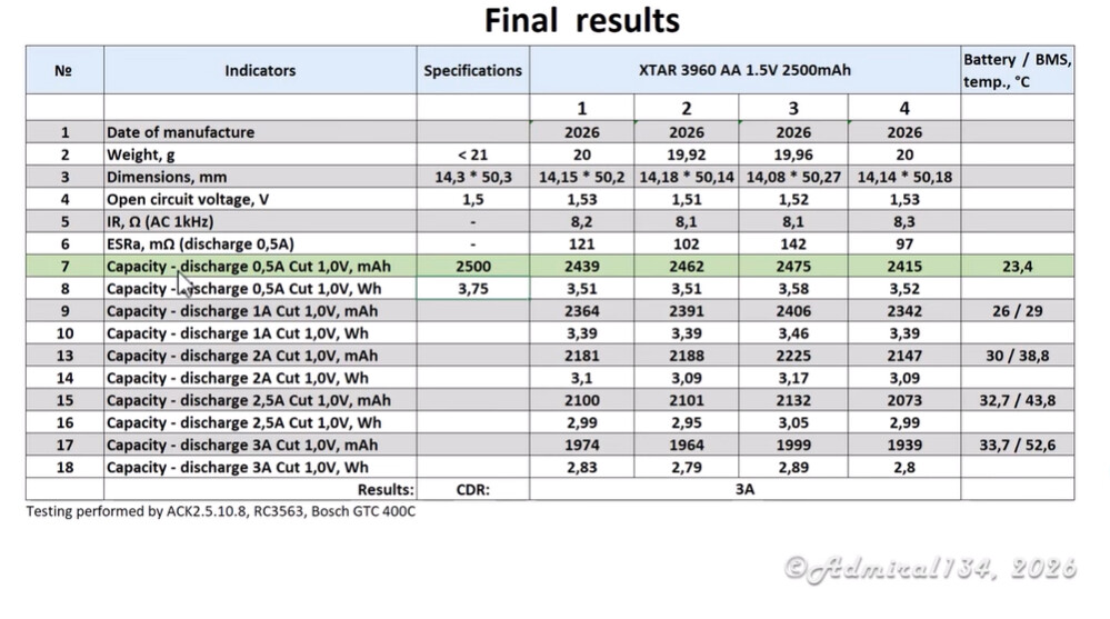 【Updated】 Test of XTAR AA 1.5V 3600 Lithium battery - Capacity, Discharge & Thermal Results