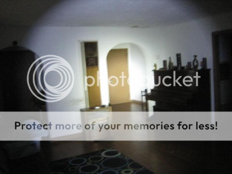 Manafont Ultrafire 3-mode XM-L T6 drop-in wrapped in copper in L2T host with McClicky switch, AR coated UCL lens, and freshly charged AW IMR 18650, target was the brown door in the distance: