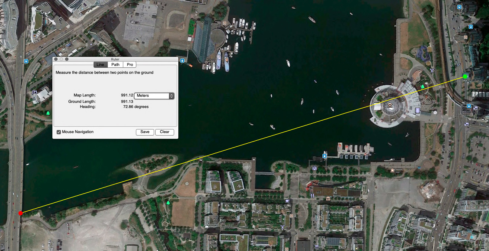 Here is a Google Earth measurement, the red dot on the left is where I was on the bridge and the green dot on the right is the target…